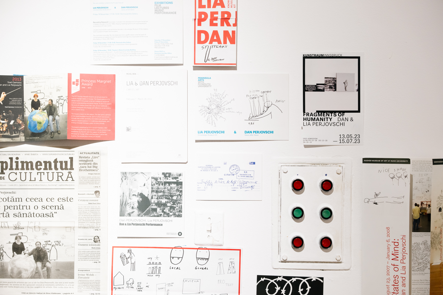 The topics addressed in the Emergencies exhibition encompass a series of events that mark global society. Thus, Lia and Dan Perjovschi’s installations confirm the artists’ grounding in contemporary issues. Stemming from their upbringing during the communist era and their status as witnesses to democratic liberation, the artists have reclaimed, through study, research, and exploration, 50 years of contemporary art history from which access has been restricted.