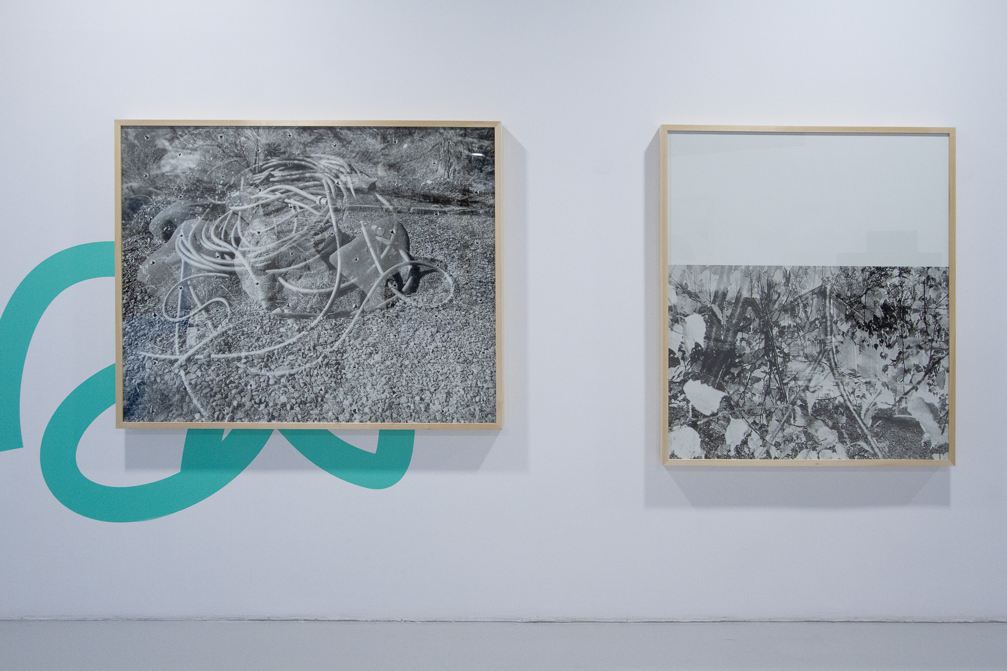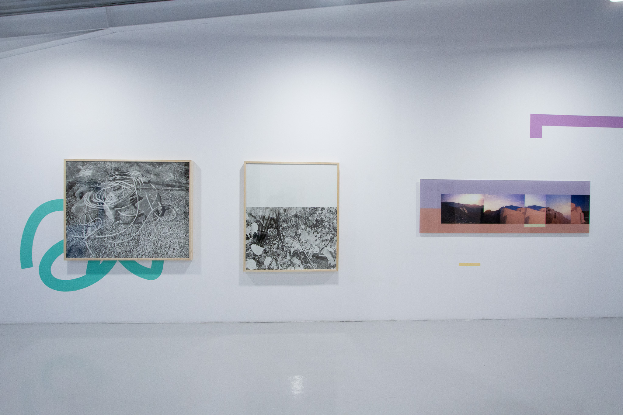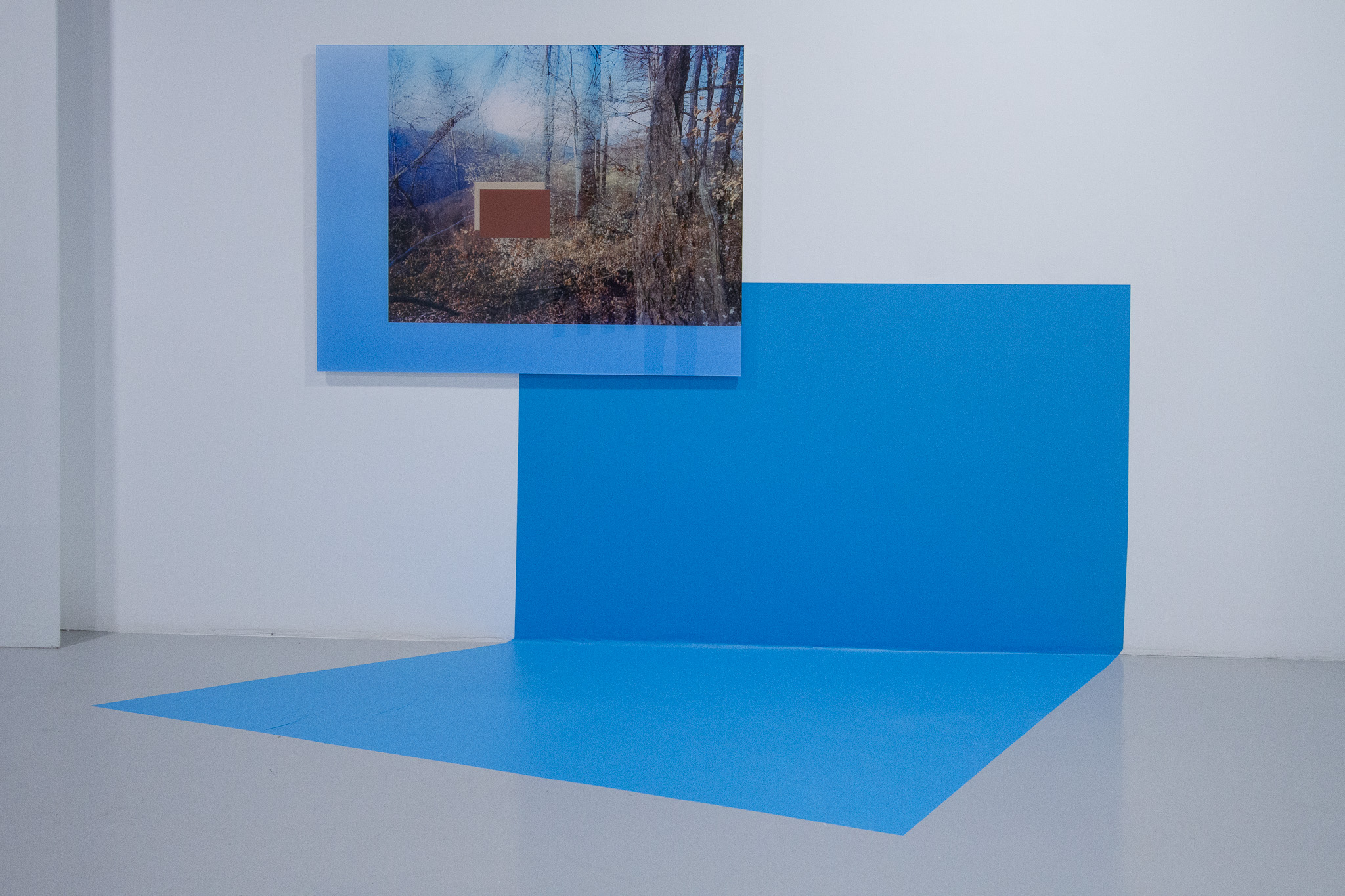 In the case of this exhibition endeavor, the “diversion” directs the viewer toward perceptual analysis. The monumental scale of the works, their organic cohabitation with colored vinyl signs, and their spatial installation allow the viewer to become immersed in an abstract, semiotic space. Is this process arid or “cold”? I wouldn’t say so. The images have a distinct poetics; the fragments of natural or urban landscapes bear witness to the artist’s wanderings, in which the camera functions like a seismograph of her inner states.