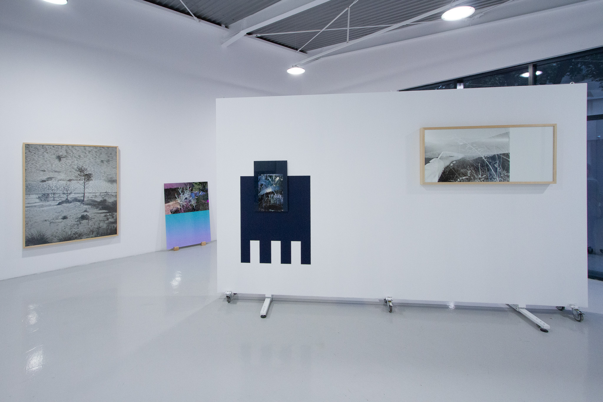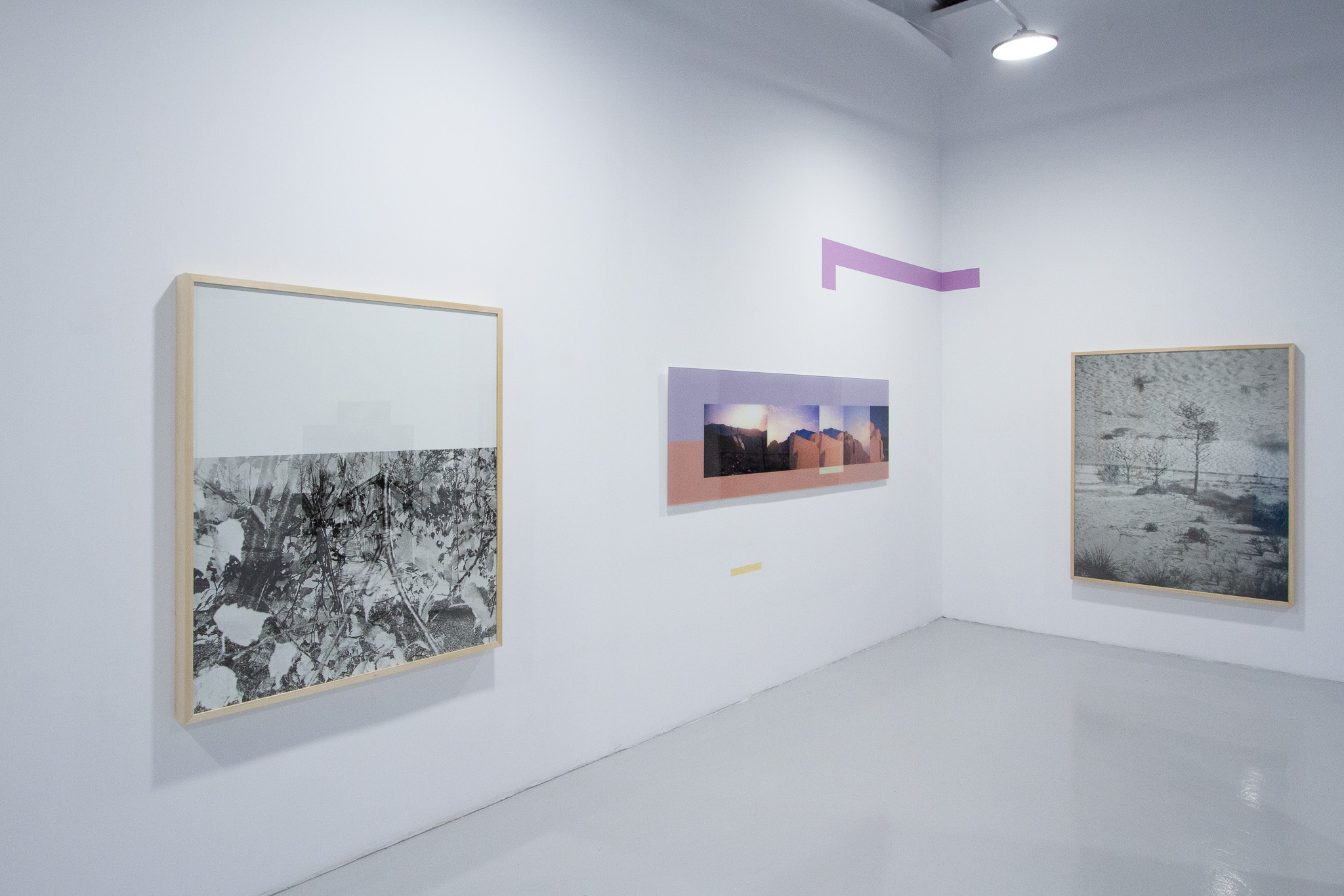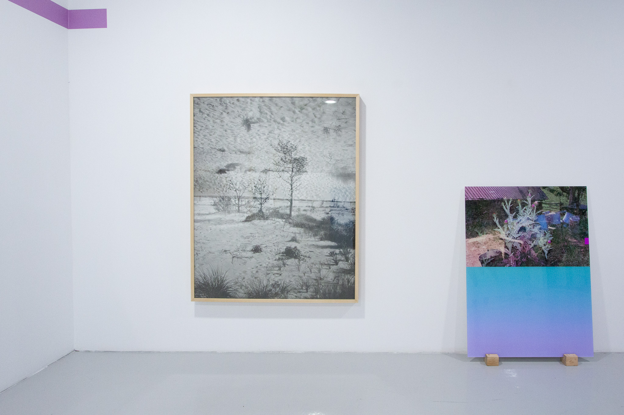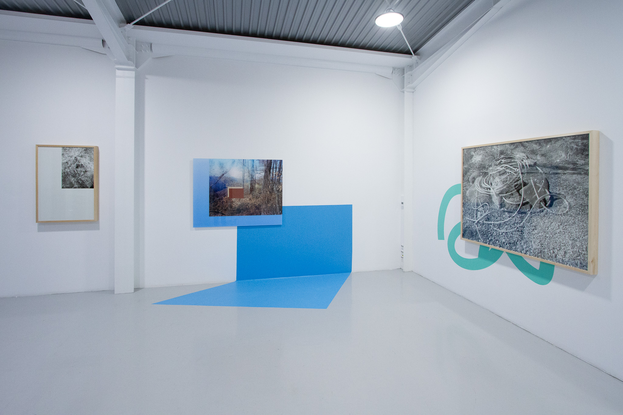 In the case of this exhibition endeavor, the “diversion” directs the viewer toward perceptual analysis. The monumental scale of the works, their organic cohabitation with colored vinyl signs, and their spatial installation allow the viewer to become immersed in an abstract, semiotic space. Is this process arid or “cold”? I wouldn’t say so. The images have a distinct poetics; the fragments of natural or urban landscapes bear witness to the artist’s wanderings, in which the camera functions like a seismograph of her inner states.
