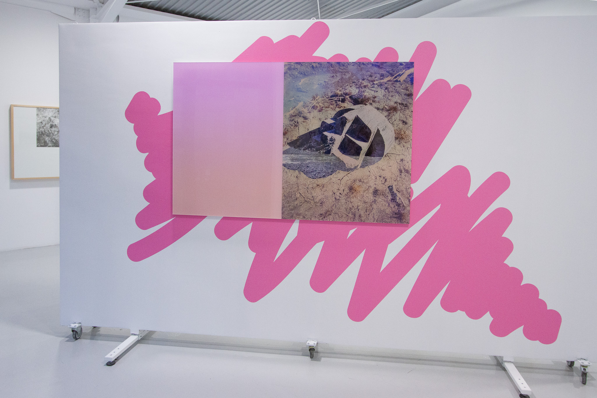 The visual situations created by the artist in the gallery space involve the cohabitation of multiple elements: flat vinyl shapes in chromatic harmony with the photographic images, which in turn are constructed by layering multiple images. This photomontage technique has historical roots in the artistic practices of the Surrealists in the early decades of the 20th century, when the juxtaposition of multiple images aimed to divert the viewer’s attention from the real world, projecting them instead into the universe of the subconscious.