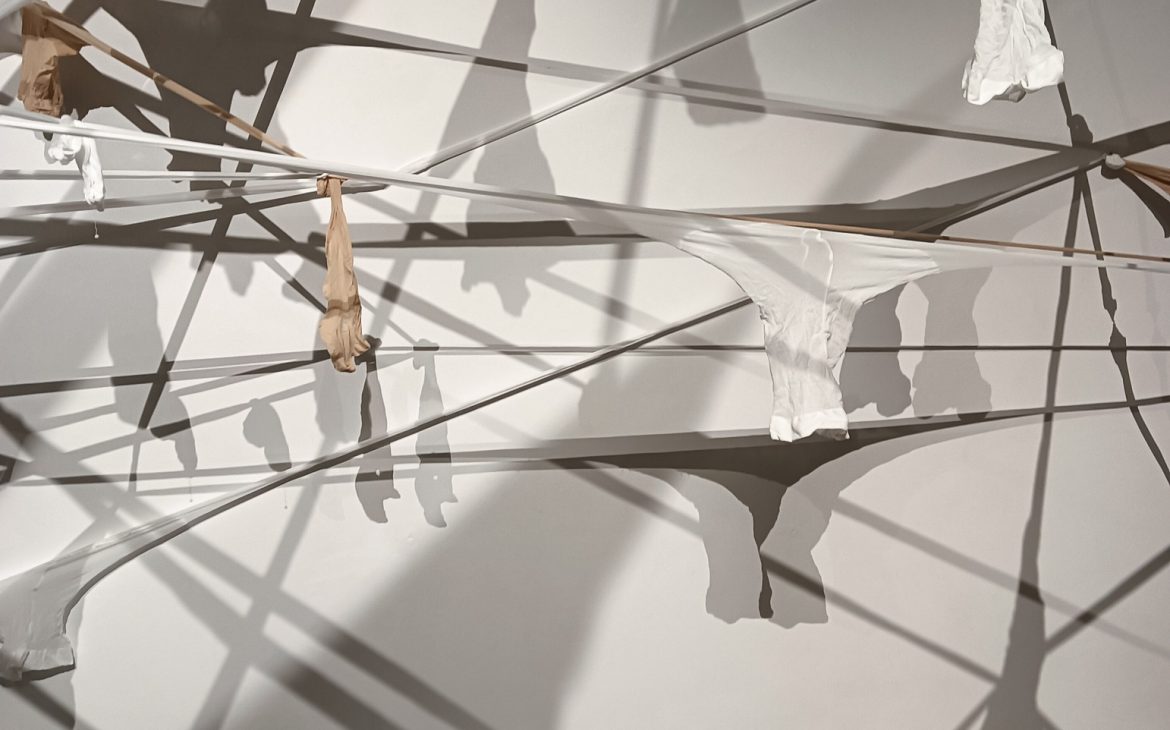 We chose to work with artificial silk stockings — a fragile, almost transparent material that carries the marks of time and reflects the vulnerability of women.