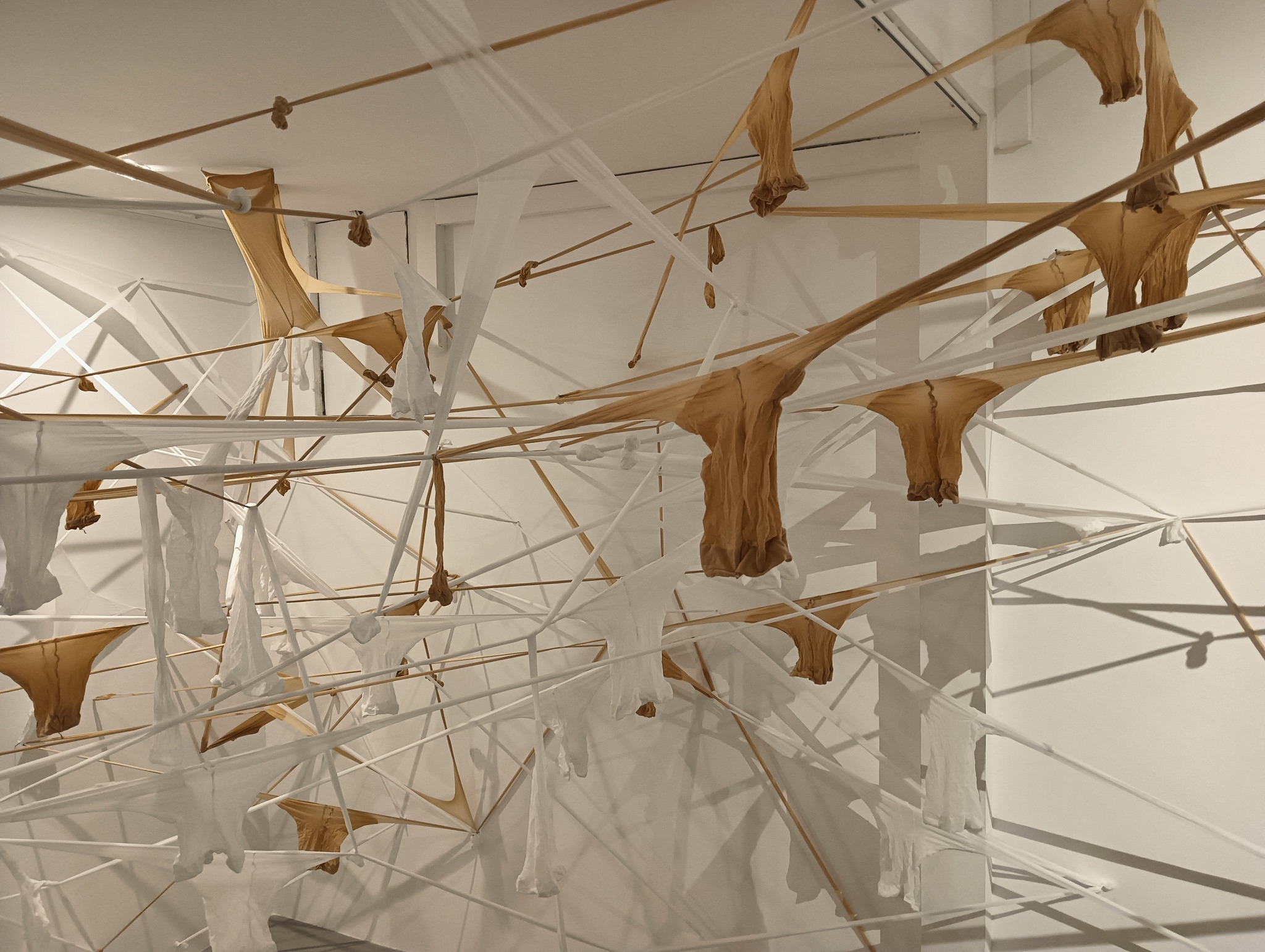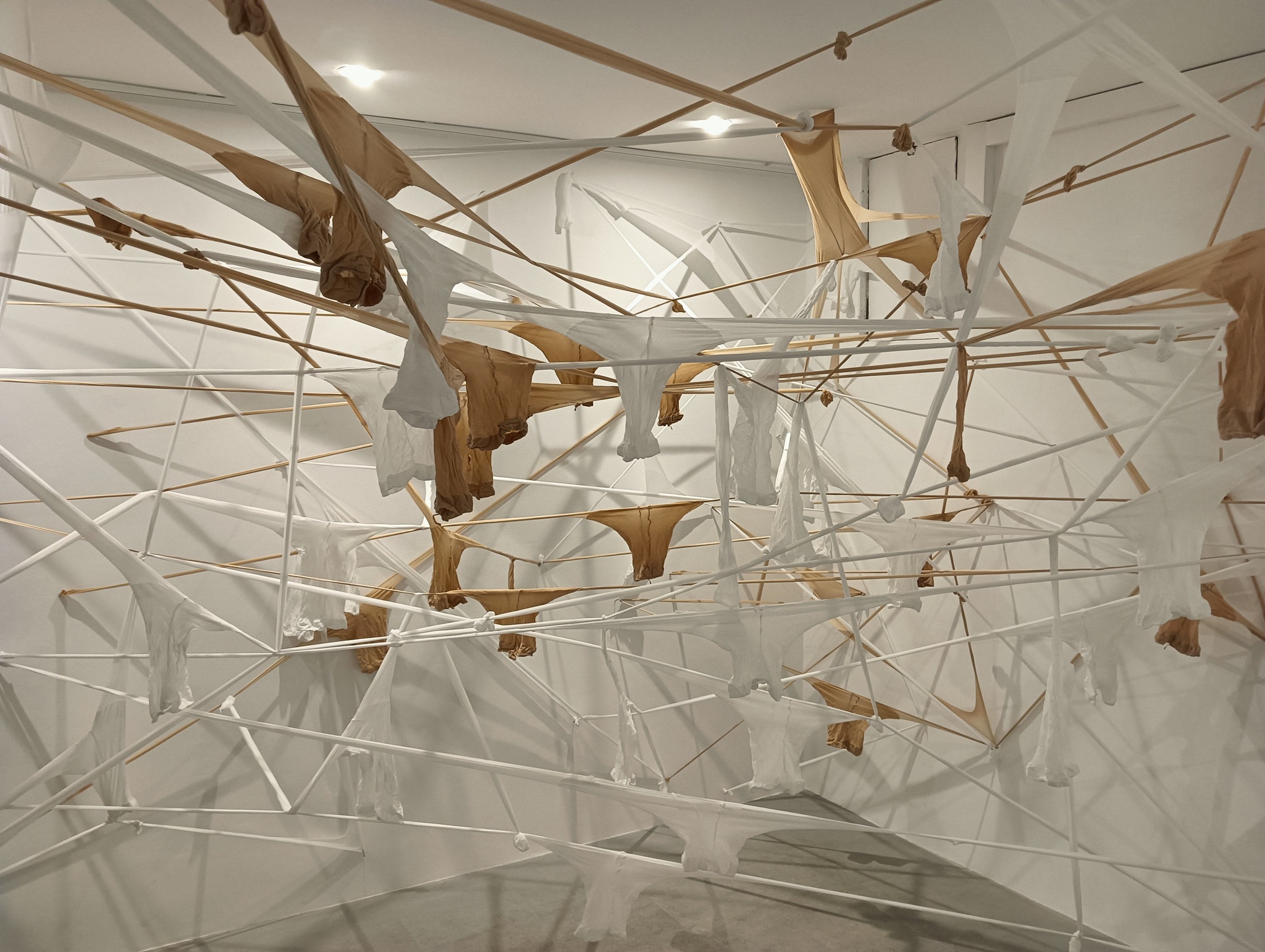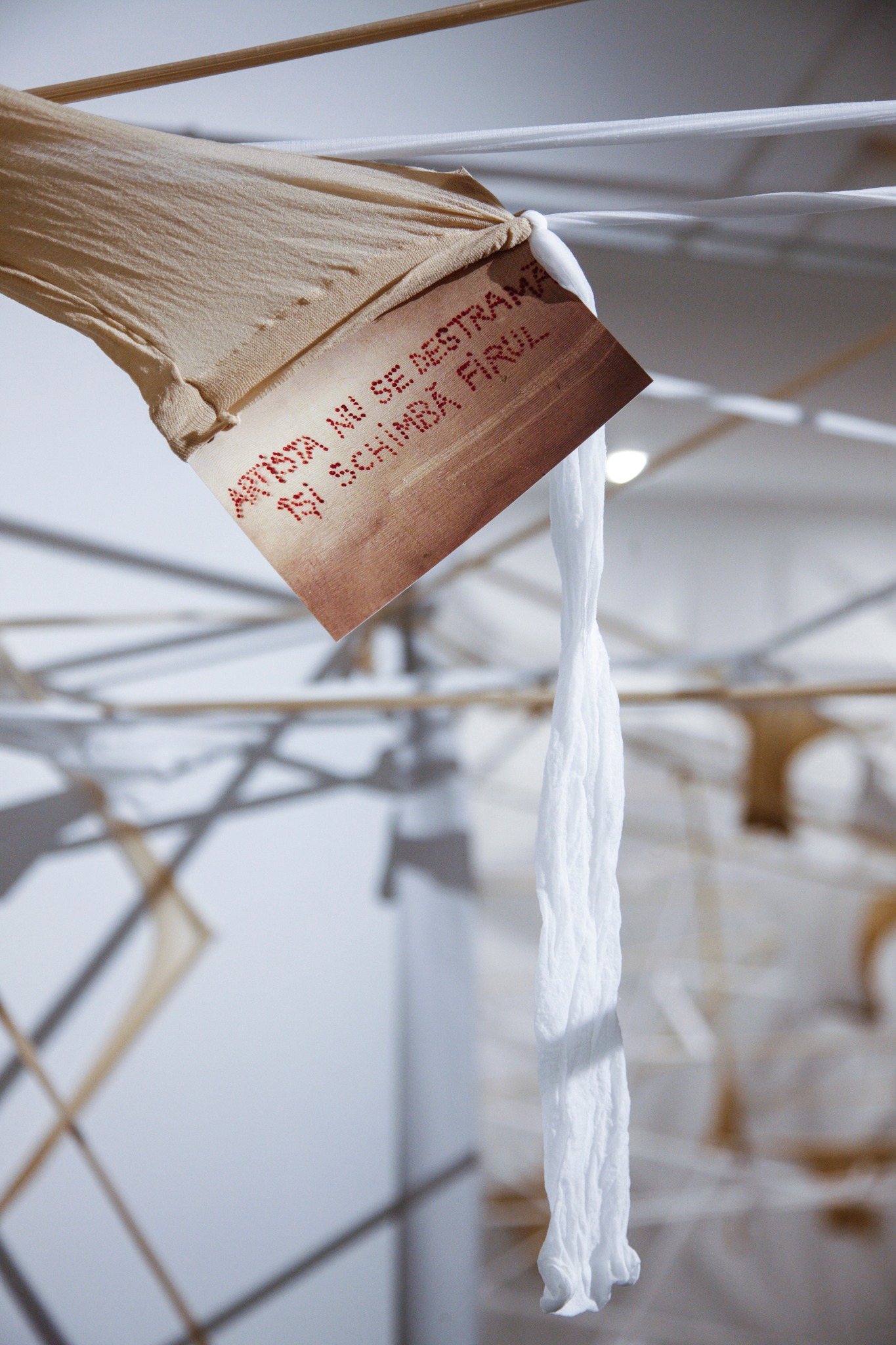 The performative installation “Proces de remaiere” by Aproximativ 28 Group — composed of artists Ana Bănică, Cuzina, Oana Marinică, Alina Paina, Alina Șerban, Dora Tishmann, and Mihaela Moldovan — can be visited at 15 Design Gallery (63 Lipscani Street, Bucharest). The project brings together seven artists, mothers, and women with diverse experiences in a shared act of reweaving and healing, exploring fragility, memory, and resilience through artificial silk stockings and the symbolic gesture of mending.