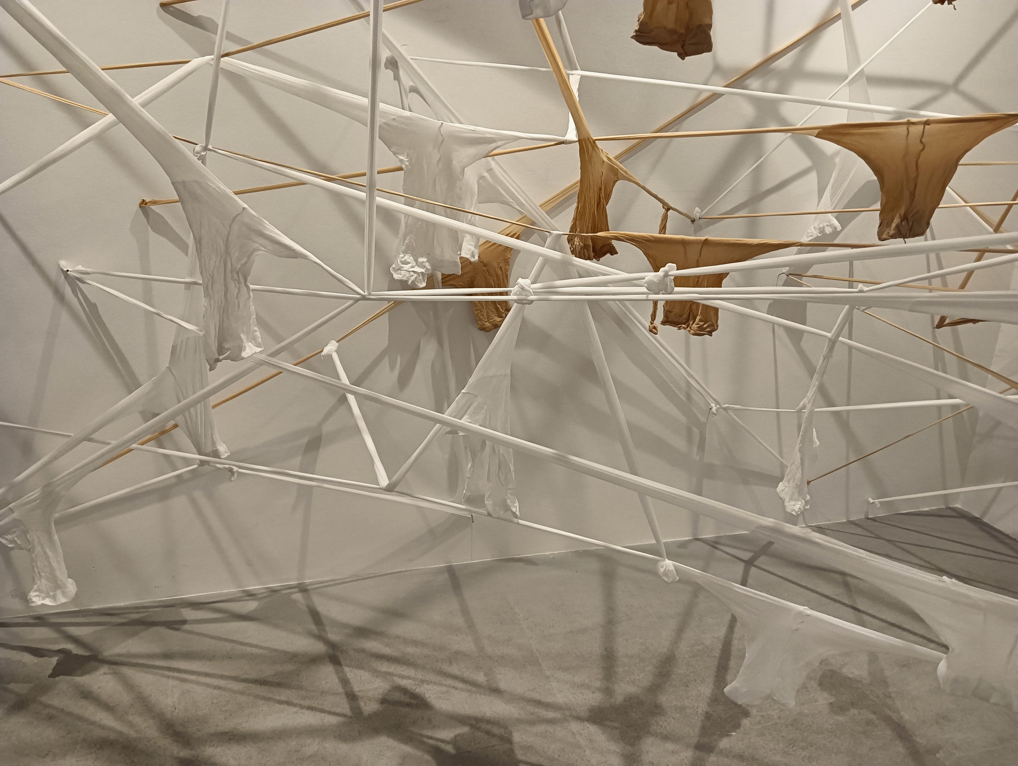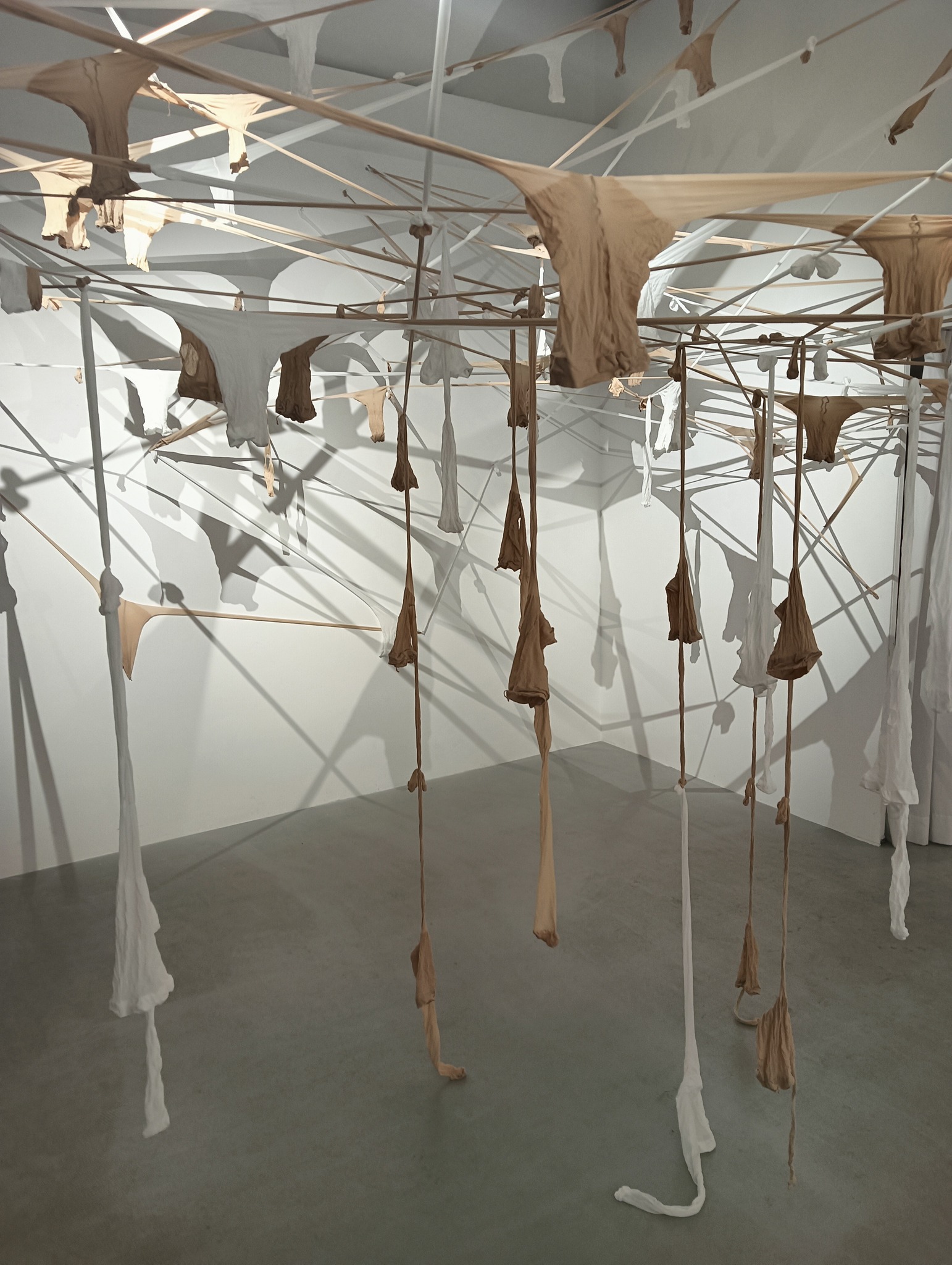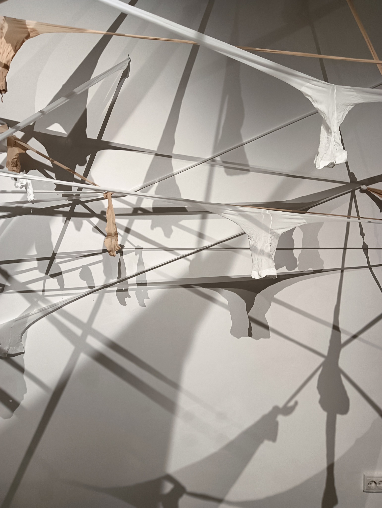 We chose to work with artificial silk stockings — a fragile, almost transparent material that carries the marks of time and reflects the vulnerability of women.