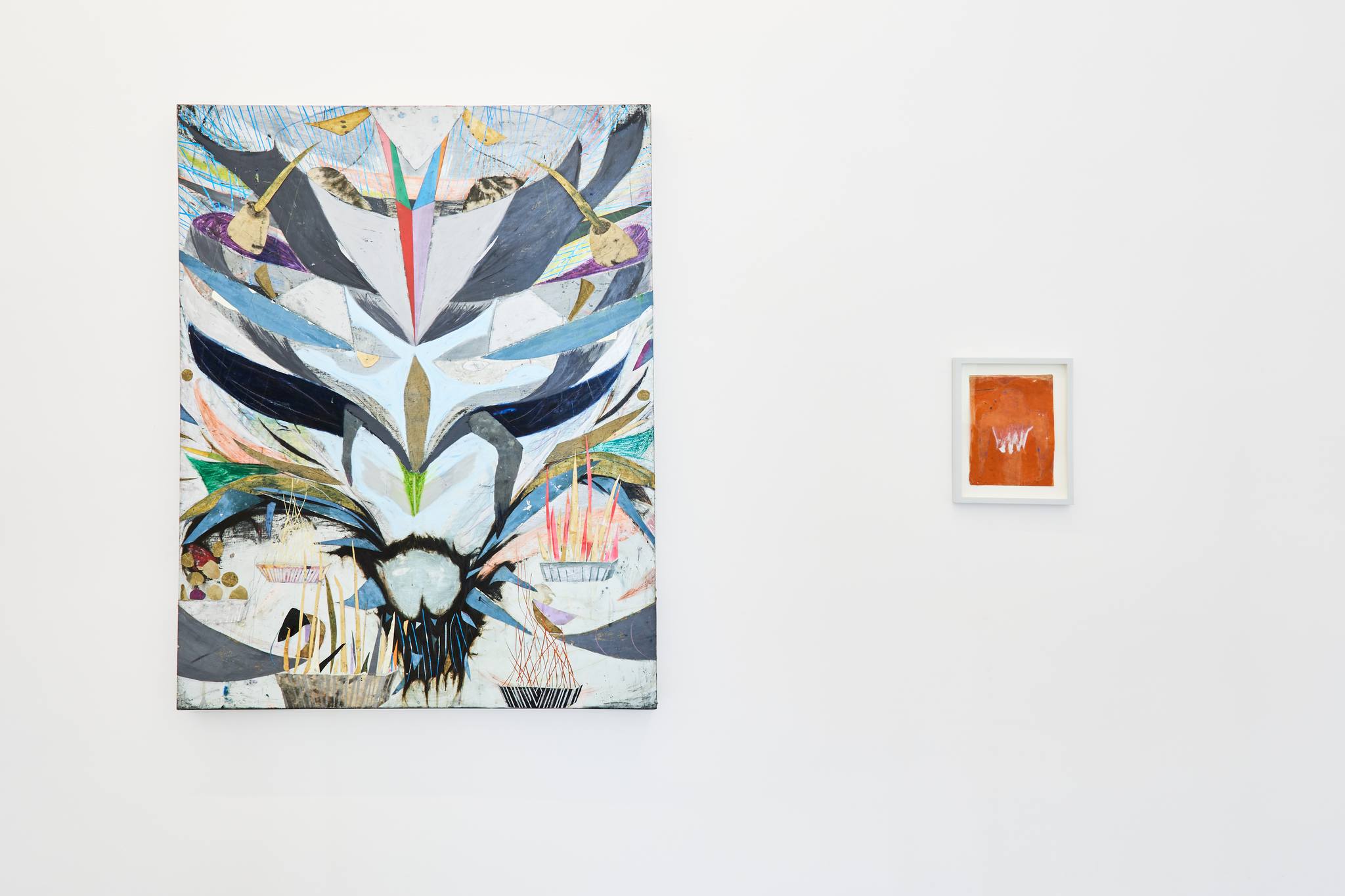Works such as “Only Eating Potatoes” (2015) or “Our Dead Plant” (2010-2020) by the London artist Ross Taylor (b. 1982) inspire us from the very title, a fictional universe populated by characters created by overlapping landscapes and bright colours, proposing the meeting of heterogeneous spaces, constantly alluding to each other. This obsession with spatiality gives rise to forms that can hardly be assimilated into a particular kingdom or species. The leaps between everyday and mythical imaginings, psychological interior and exterior, and prehistoric and hypermodern make room for benign creatures strung together like inserts in a travelogue.