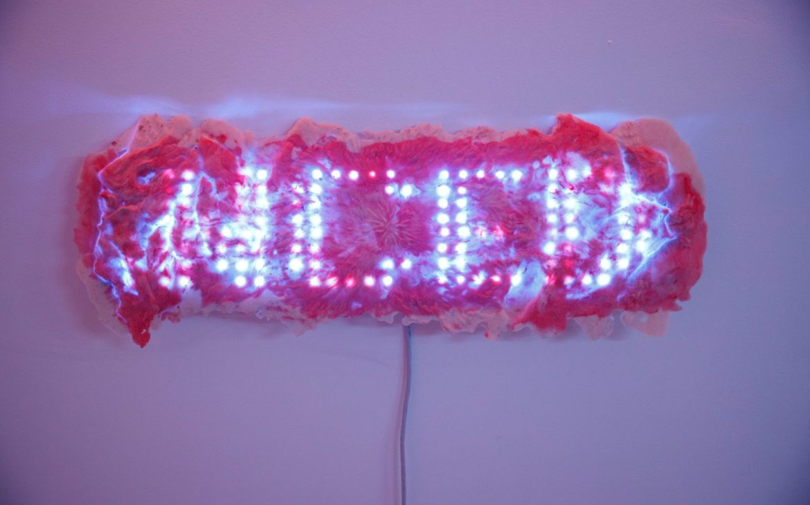 A similar message is played by the luminous text that runs continuously, in the mixed media installation in fluffy pinks, one of the first works that draws attention in “Dance of the Butterflies”: “This wonderful art had held him entranced for a long while but now he was dreaming of another experiment. He wished to go one step beyond. Instead of artificial flowers imitating real flowers. Natural flowers should mimic the artificial ones.” This quotation taken from the novel titled À rebours (1884), translated as “Against Nature”, by the author and art critic Joris-Karl Huysmans, belongs to the decadent French literature of the 19th century. In this novel, “going against the grain” is supposed to be evidenced by outlining a taxonomy of the obsessions belonging to the central character, Des Esseintes. These obsessions are all expressions of his particular aestheticism. They are rationalized as exemplifying the eccentricity of Des Esseintes, who is tired of the French bourgeoisie and decides to retire into seclusion. This isolation is a deeply personal and quintessentially artistic one, born out of his experiences of hyperaesthesia, which is an increased sensitivity to stimuli, tactile ones in particular.