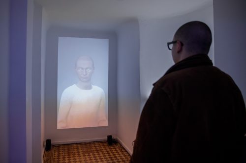 The last room of the exhibition space highlights fragments of 3D simulations and digital worlds populated by human beings, difficult to identify, characters captured either with closed eyes or from behind, running. They seem to be worlds and characters adrift, located in urban and natural landscapes that swallow each other, without any clear demarcations between them. The border between natural and artificial therefore remains undefined.