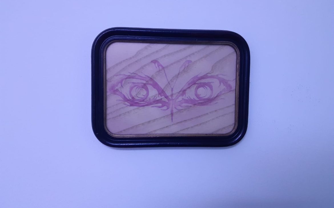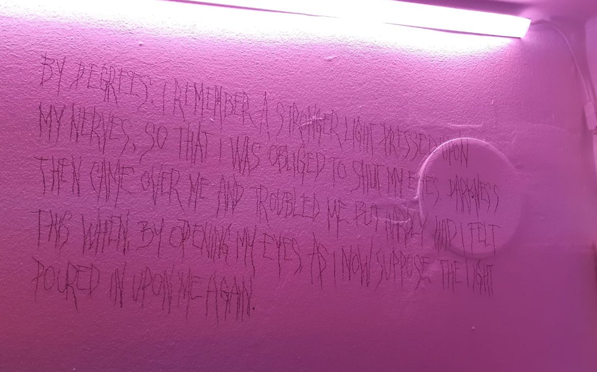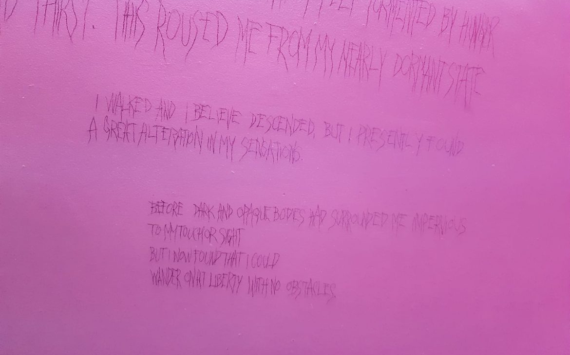 Excerpts from the 11th chapter of the book, the moment when the monster comes to life and is aware of its own existence, are inscribed on the walls of the Collateral artspace. They manage to capture the way in which the creature learns through sensory experience about the duality of being in the world, existence requiring both coolness and warmth, activity and rest, food, water, communion, but also solitude. Along with these quotations, the eye is also drawn to murals of butterflies and butterfly wings. A framed representation of the eyespots on the open wings of a specimen of the Nymphalidae family adds to the pieces on display, and seems to rather suggest that direct contact is being made, while wandering the rooms of the artspace, with the penetrating gaze of a character not fully revealed.