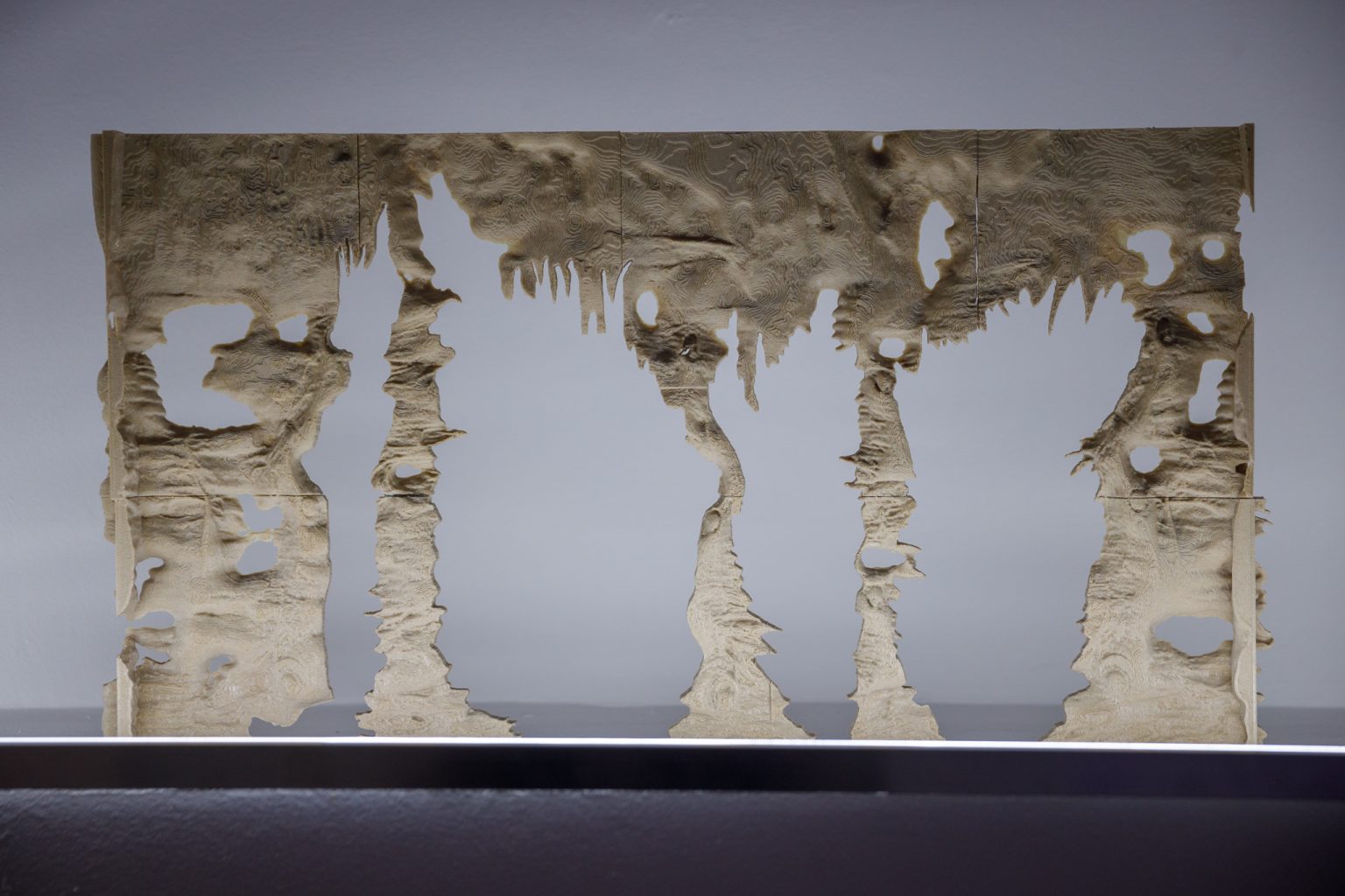 The second source of inspiration for the exhibition is a “red stencil”, made more than 64,000 years ago, “by a Neanderthal (most likely)”. This choice exemplifies the themes repeatedly addressed by Ganea, throughout his artistic career: a mapping of human activities reflected through not only an anthropomorphization, but also a personification of nature, as well as the artist’s personal approach to the multiple problems raised by the posthumanist existential crisis. The latter positions man in the same line with animal, vegetable, and even mineral species. In essence, what seems to be referentially pursued within the present exhibition is the start of a discussion on the theme of rethinking our relationship to this re-evaluation of the human condition. This ought to be done, precisely because of the many apparent limitations of humanity.