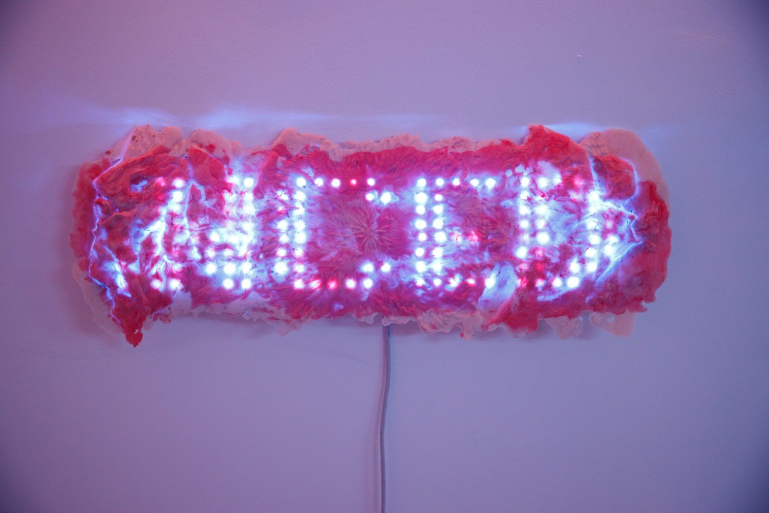 A similar message is played by the luminous text that runs continuously, in the mixed media installation in fluffy pinks, one of the first works that draws attention in “Dance of the Butterflies”: “This wonderful art had held him entranced for a long while but now he was dreaming of another experiment. He wished to go one step beyond. Instead of artificial flowers imitating real flowers. Natural flowers should mimic the artificial ones.” This quotation taken from the novel titled À rebours (1884), translated as “Against Nature”, by the author and art critic Joris-Karl Huysmans, belongs to the decadent French literature of the 19th century. In this novel, “going against the grain” is supposed to be evidenced by outlining a taxonomy of the obsessions belonging to the central character, Des Esseintes. These obsessions are all expressions of his particular aestheticism. They are rationalized as exemplifying the eccentricity of Des Esseintes, who is tired of the French bourgeoisie and decides to retire into seclusion. This isolation is a deeply personal and quintessentially artistic one, born out of his experiences of hyperaesthesia, which is an increased sensitivity to stimuli, tactile ones in particular.