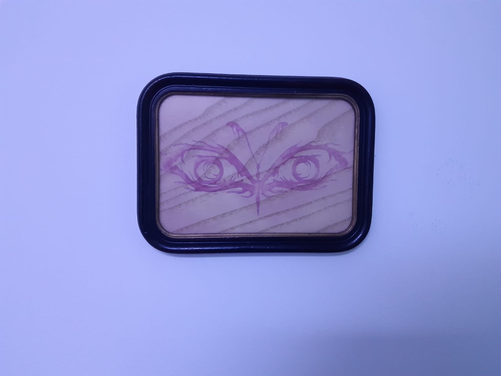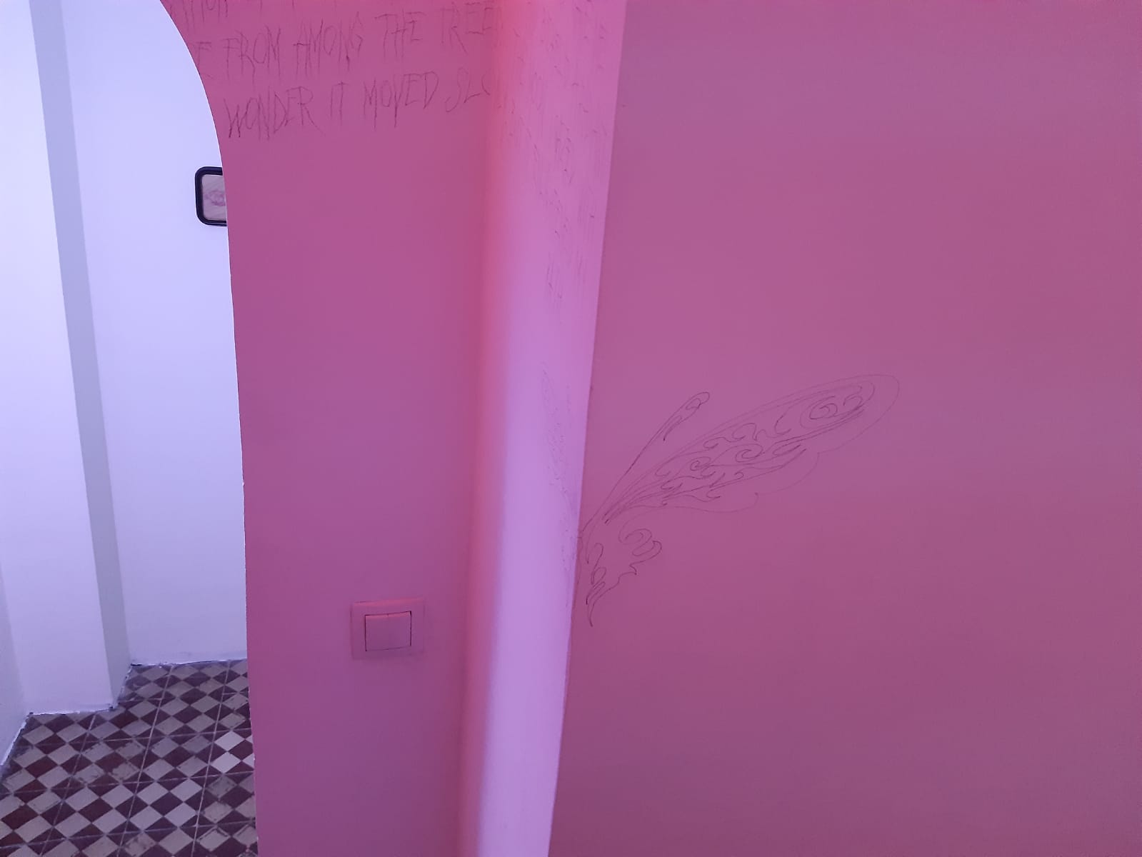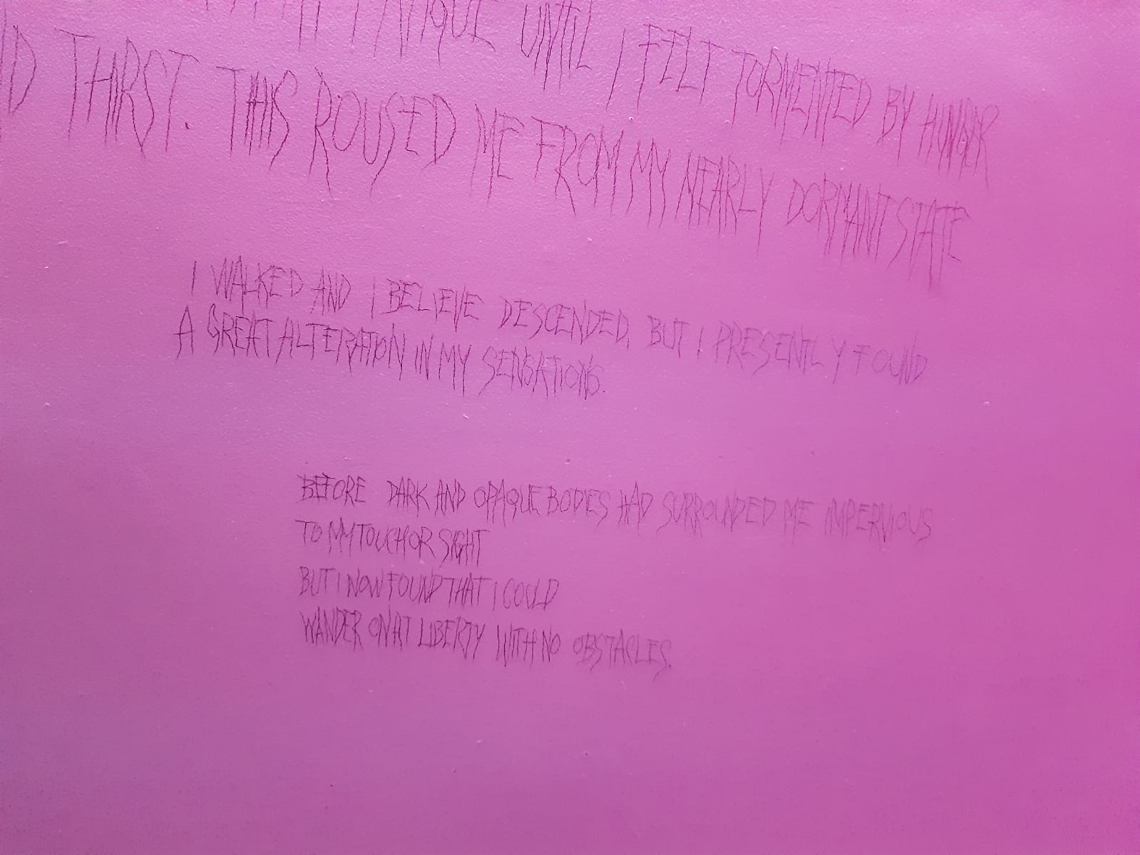 Excerpts from the 11th chapter of the book, the moment when the monster comes to life and is aware of its own existence, are inscribed on the walls of the Collateral artspace. They manage to capture the way in which the creature learns through sensory experience about the duality of being in the world, existence requiring both coolness and warmth, activity and rest, food, water, communion, but also solitude. Along with these quotations, the eye is also drawn to murals of butterflies and butterfly wings. A framed representation of the eyespots on the open wings of a specimen of the Nymphalidae family adds to the pieces on display, and seems to rather suggest that direct contact is being made, while wandering the rooms of the artspace, with the penetrating gaze of a character not fully revealed.
