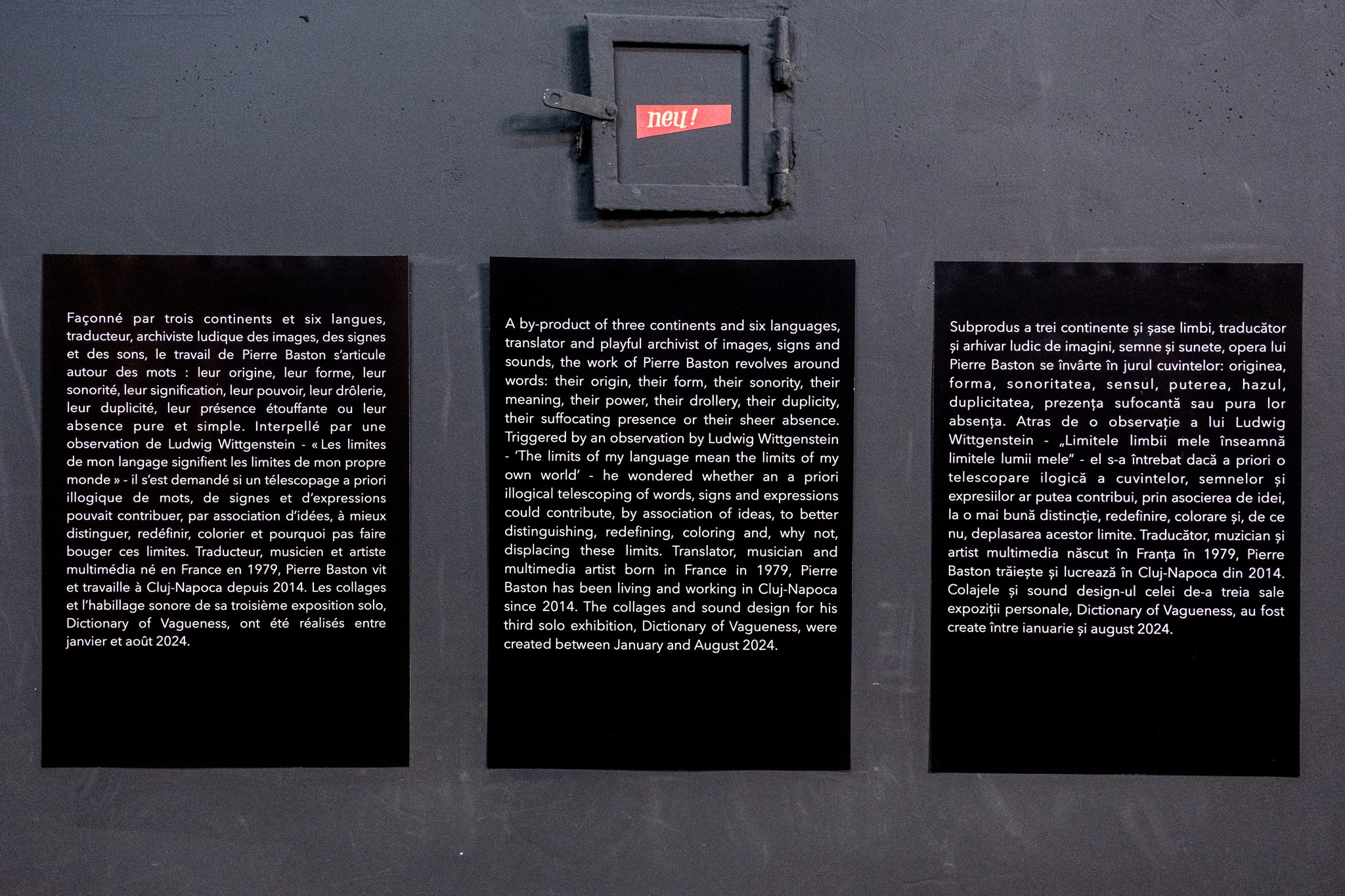 The Cosmic House in Cluj-Napoca hosts the Dictionary of Vagueness exhibition, a solo show by the artist Pierre Baston, open to the public until December 6. The exhibition invites art lovers and those passionate about exploring language and ambiguous meanings in a deep and innovative artistic experience.