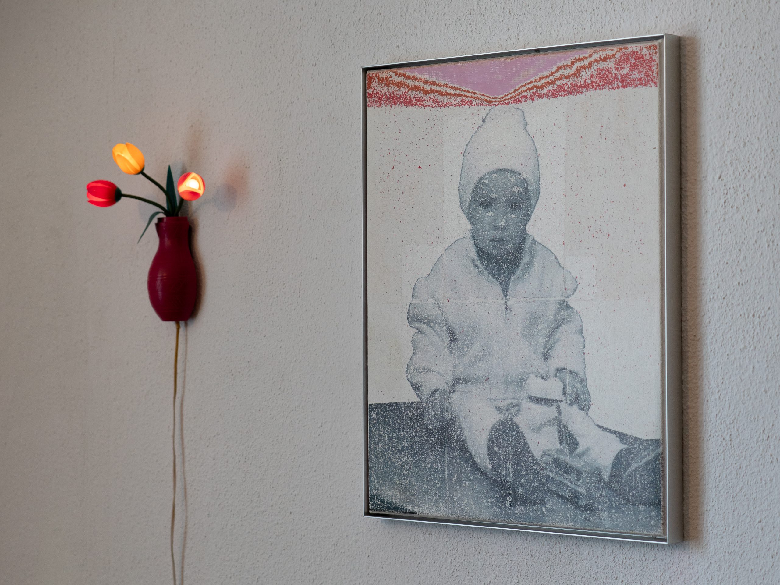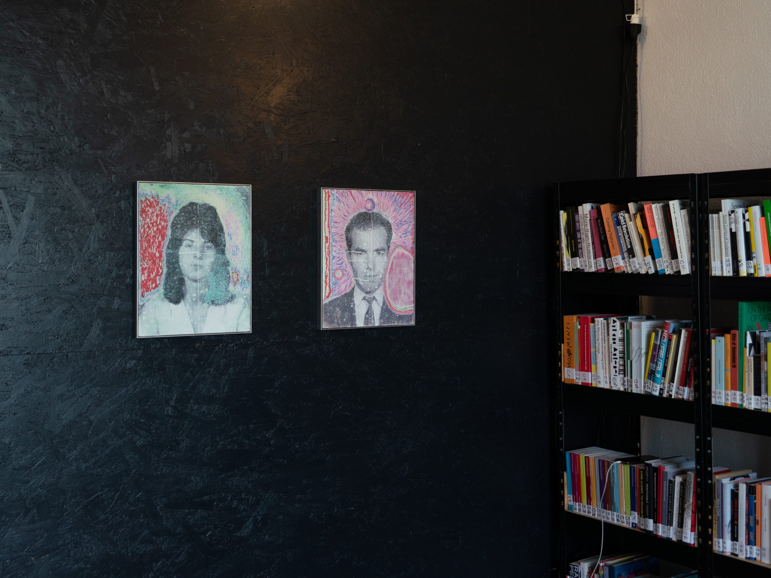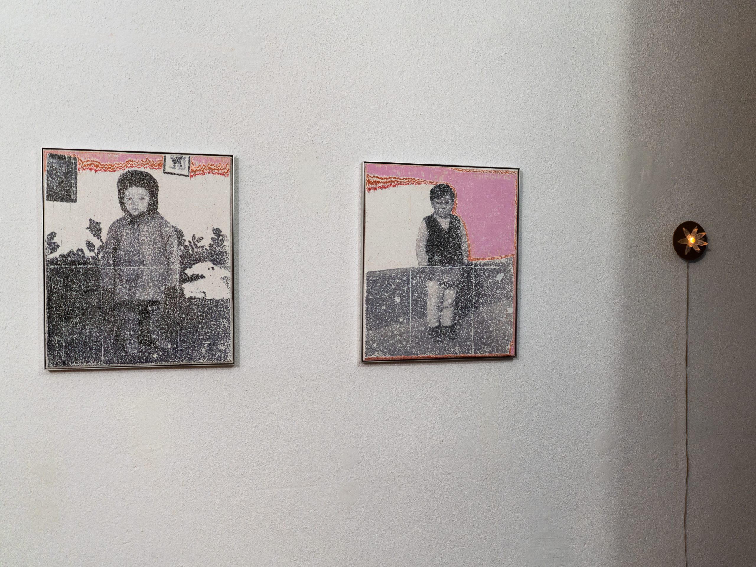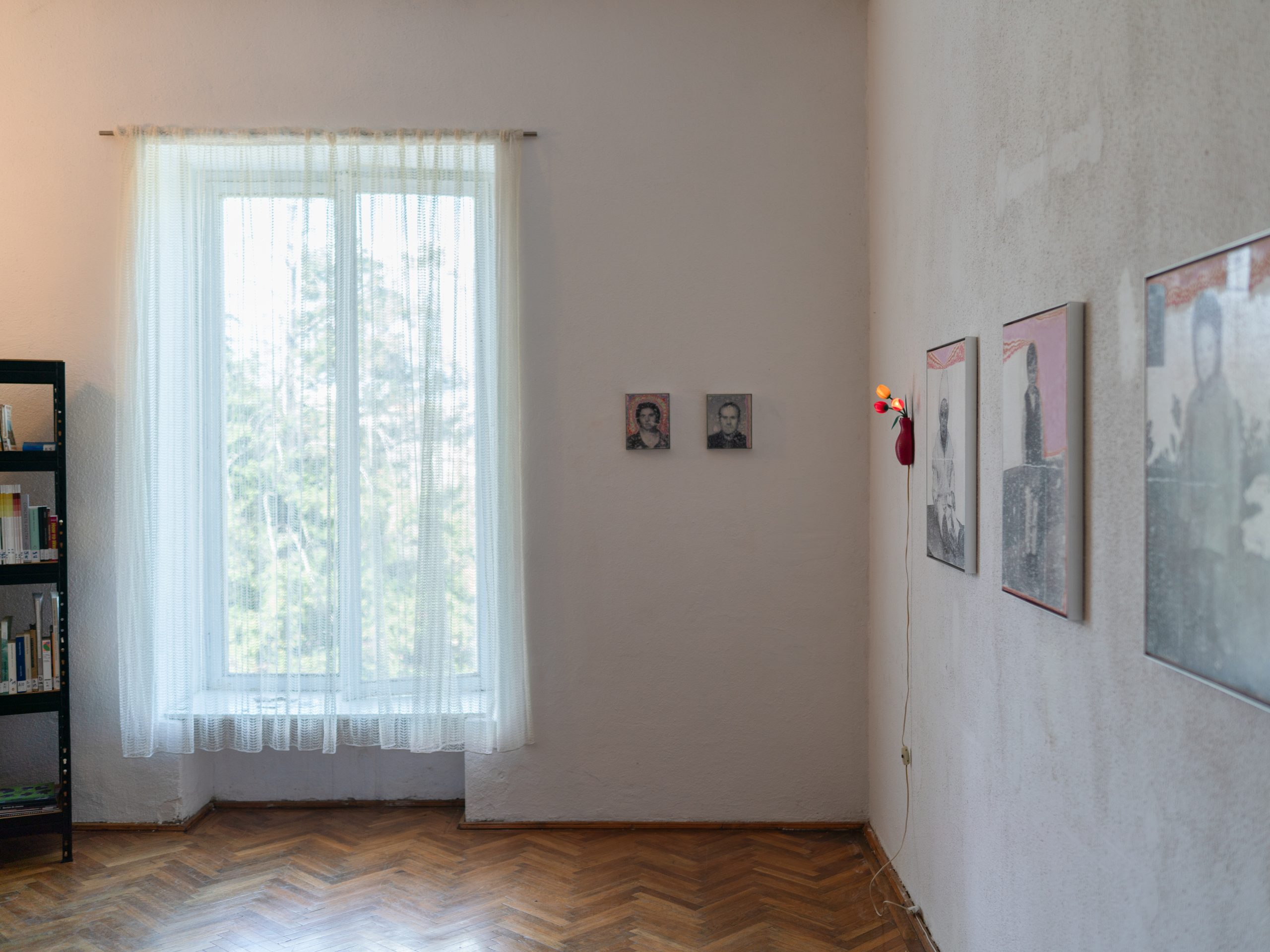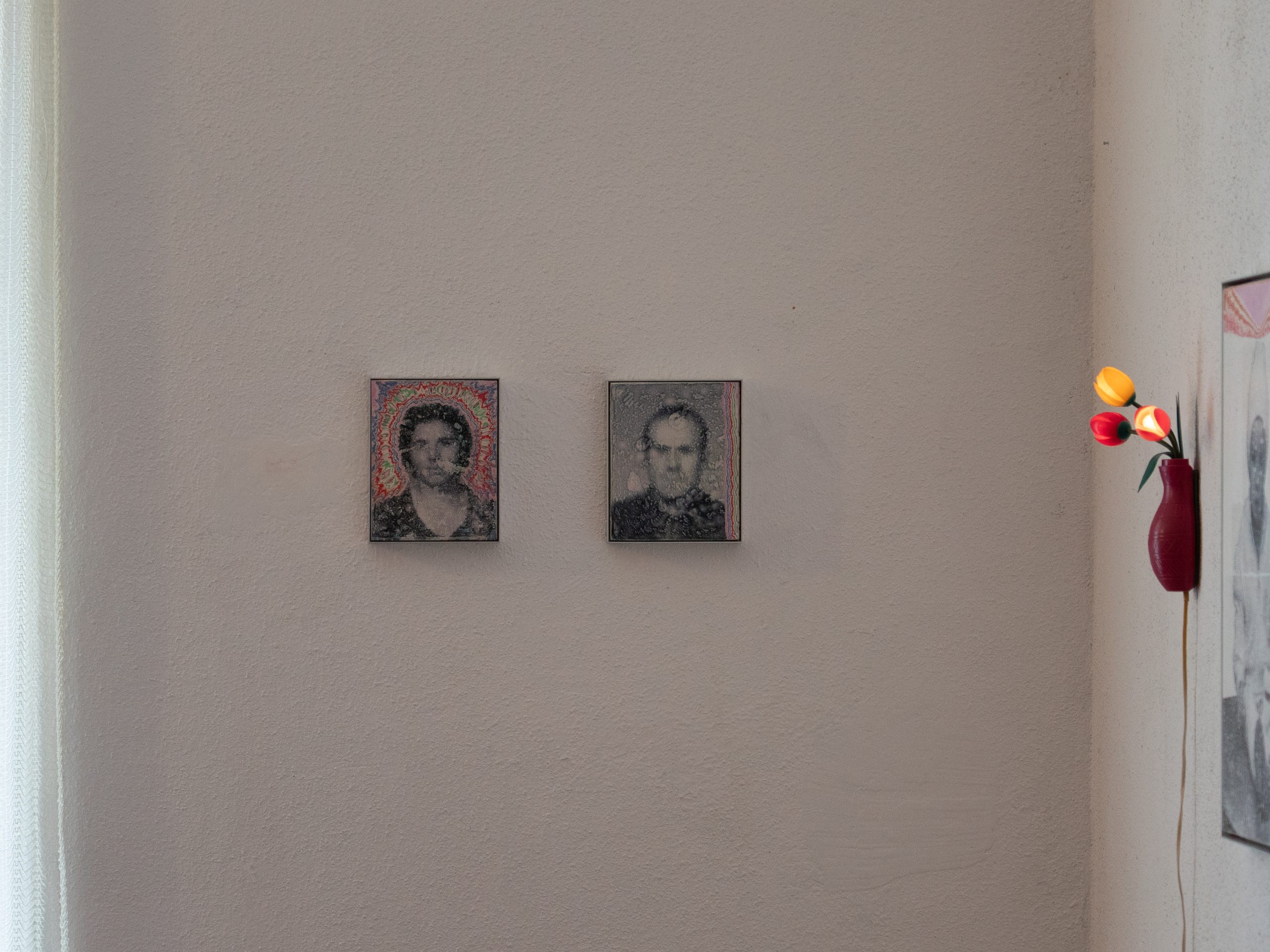 The weight of encountering the figures who have organically shaped the artist’s becoming is reinforced by the specificity of the exhibition space, which he chooses to treat as a domestic setting for intimate encounters. An installation of old lamps subtly animates the portraits, their yellow light gently amplifying the figures’ aura.