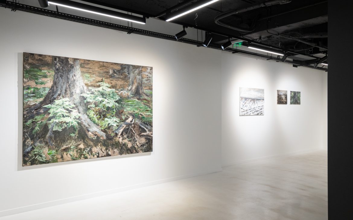 In the case of paintings, it is important to note the absence of the human figure or any elements associated with it. What asserts presence indirectly, instead, are the traces imprinted on the place. For example, when the element of the cut tree intervenes, what we see and assume has more to do with that absence than with the element itself represented. The trace left as a permanent reminder of the action has the opposite impact, as such traces give voice to the memory of the place.