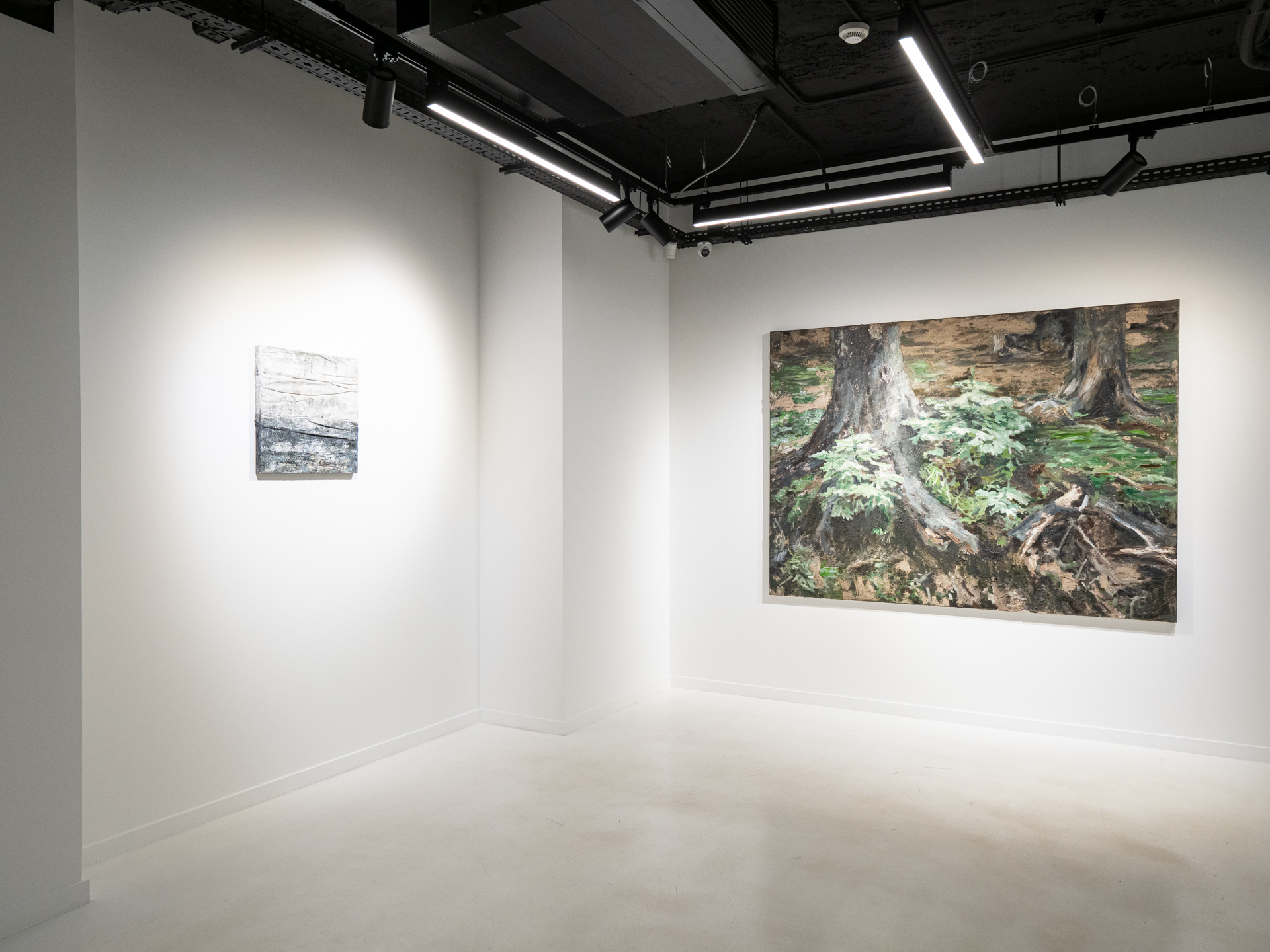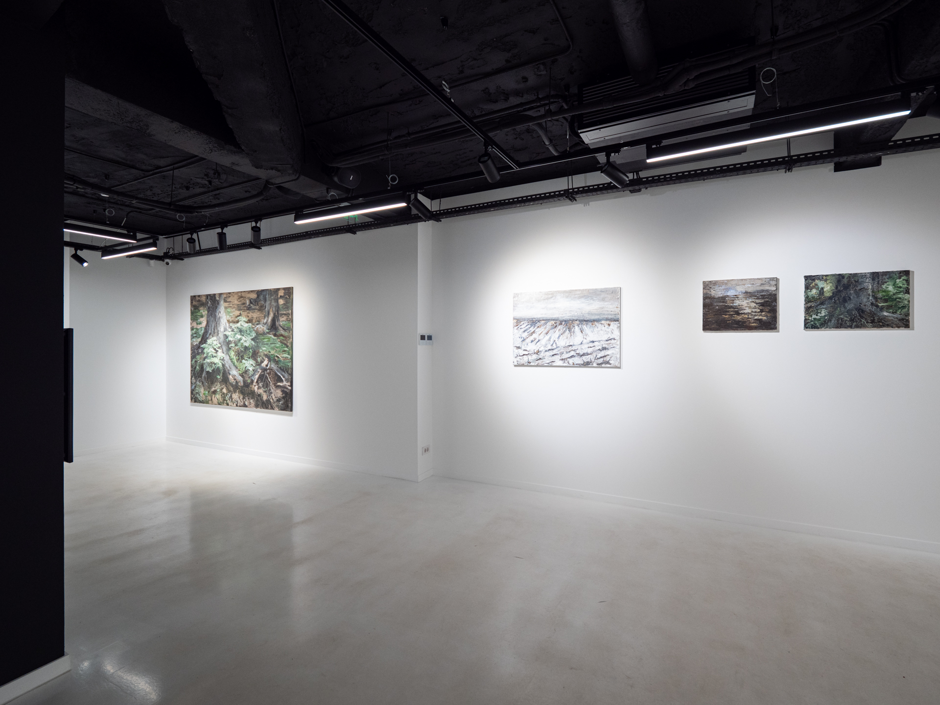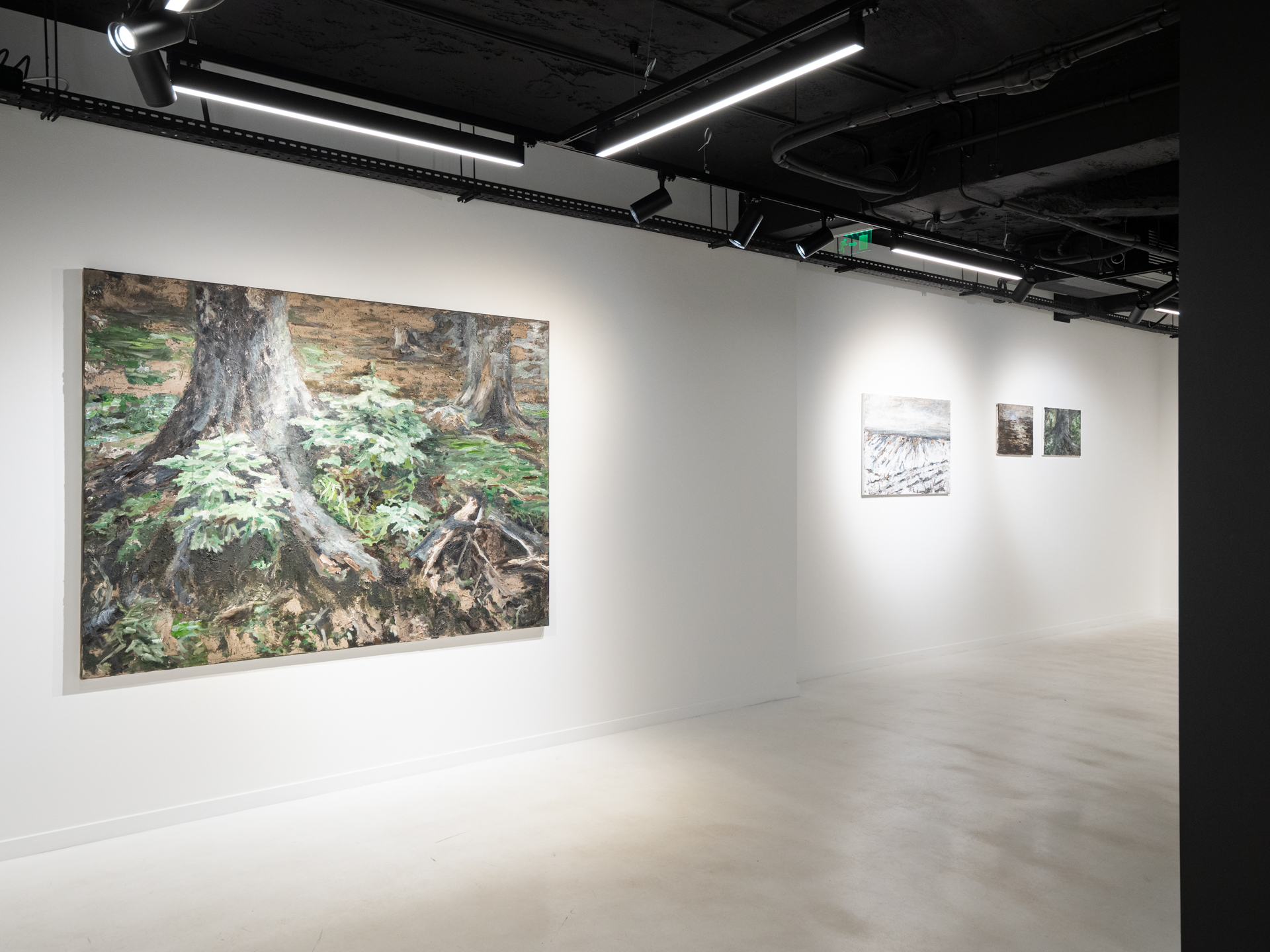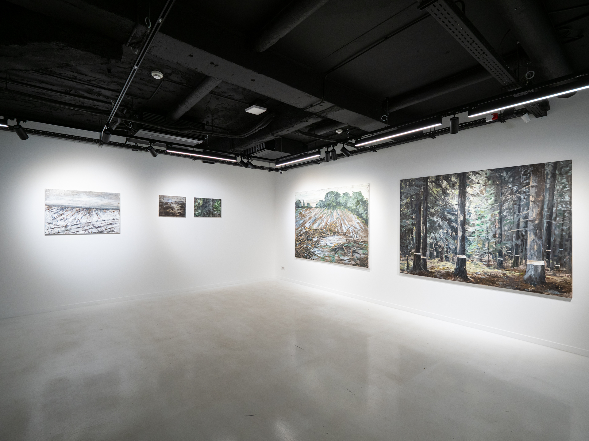 In the case of paintings, it is important to note the absence of the human figure or any elements associated with it. What asserts presence indirectly, instead, are the traces imprinted on the place. For example, when the element of the cut tree intervenes, what we see and assume has more to do with that absence than with the element itself represented. The trace left as a permanent reminder of the action has the opposite impact, as such traces give voice to the memory of the place.