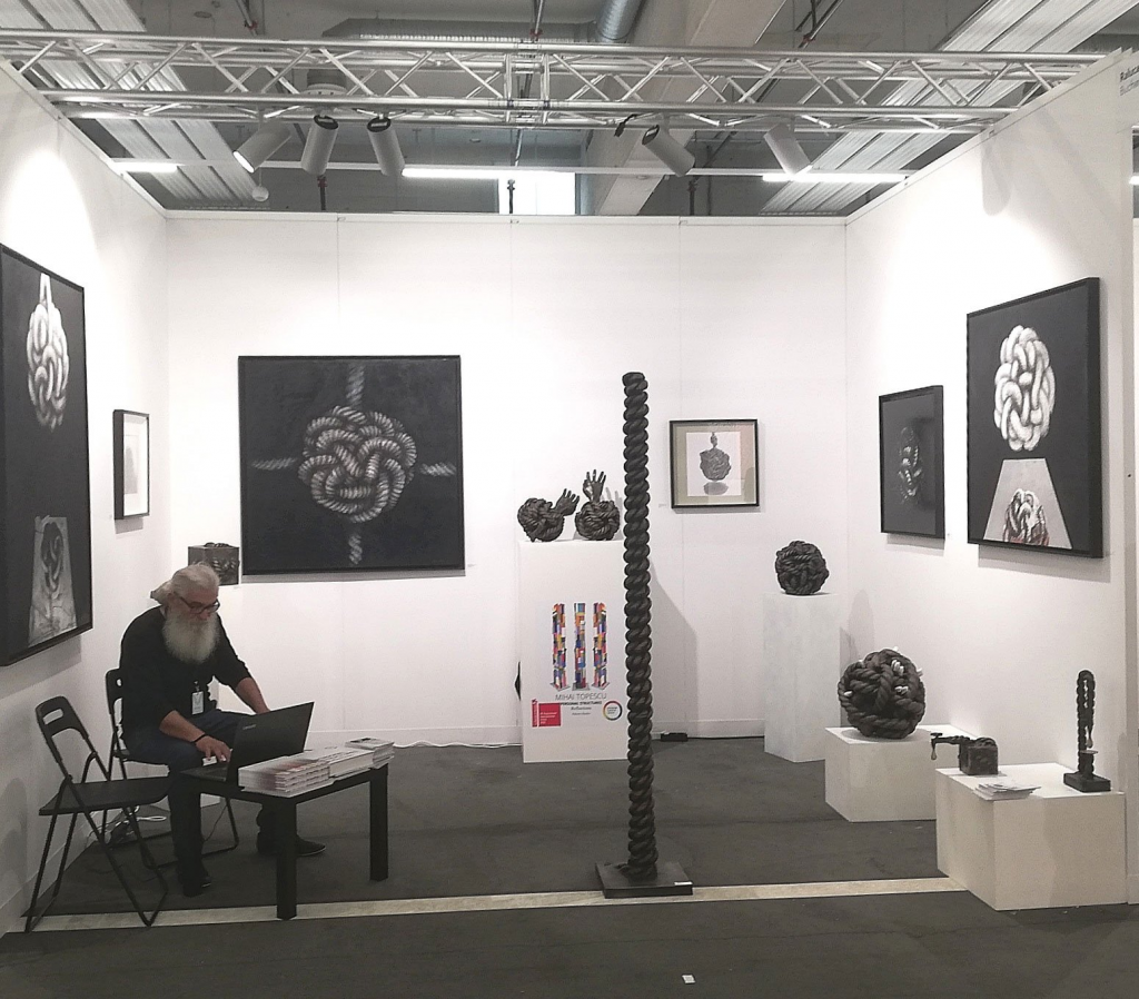 “Twisted ropes are knotted and set on pedestals (bronze sculptures) or suspended (charcoal on canvas works). Under the symbol of the ROPE and KNOT, MIHAI ŢOPESCU chose to develop a whole art show for VOLTA BASEL. His compositions bring into focus the Romanian identity elements.