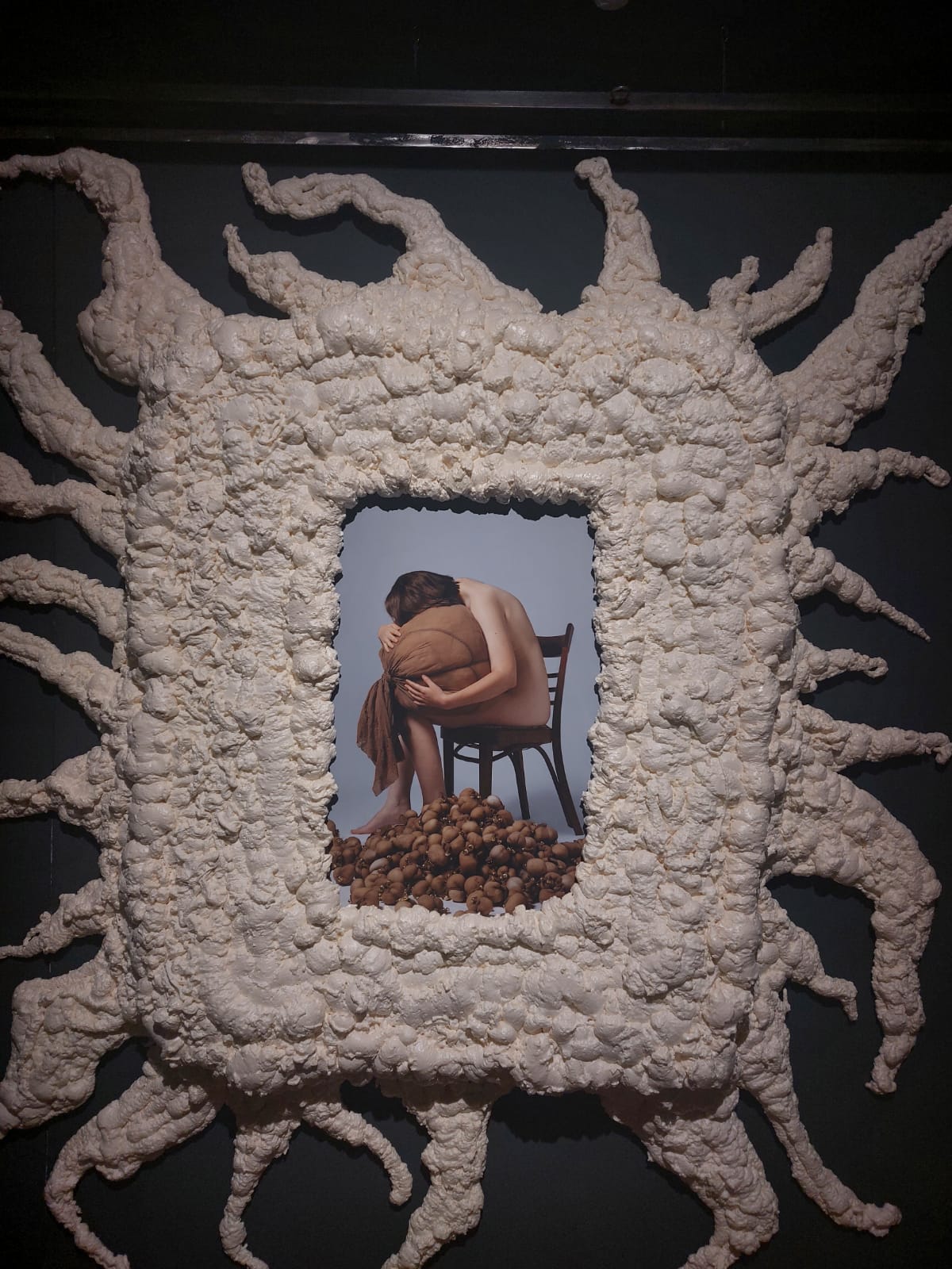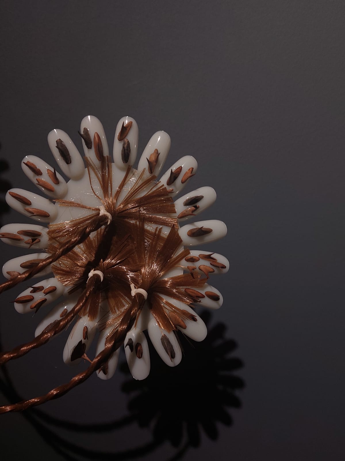 “I once wanted to become a plant…” are the words that Alexandra Boaru wants to convey both through the images made and through the texts that accompany her works, contributing to their completion. The exhibition circuit includes 8 artworks: Mother of Children, a photographic installation, whose frame made out of polyurethane foam connects the visitor, starting from the entrance, to the artist’s movable universe; Solastalgia, a sound sculpture with which the public is invited to interact; May my womb be a crawling space for all that is living and Fragile-liquid-soft, two video sculptures that give Alexandra’s attention for multi-dimensional works; A Farewell Act of Love and Corporeal Substitutes, a set of photos exhibited in the form of an installation, respectively a series of 5 pieces; Random Ordering of a Mobile Man, an installation made out of eryngium campestre (devil’s velvet) and links, which combines the fragility of dried leaves with the hardness of the metal, through a support alternation; Dried Fruiting Bodies, a work made with artificial hair and nail palette, on one hand, and rose thorns, on the other.