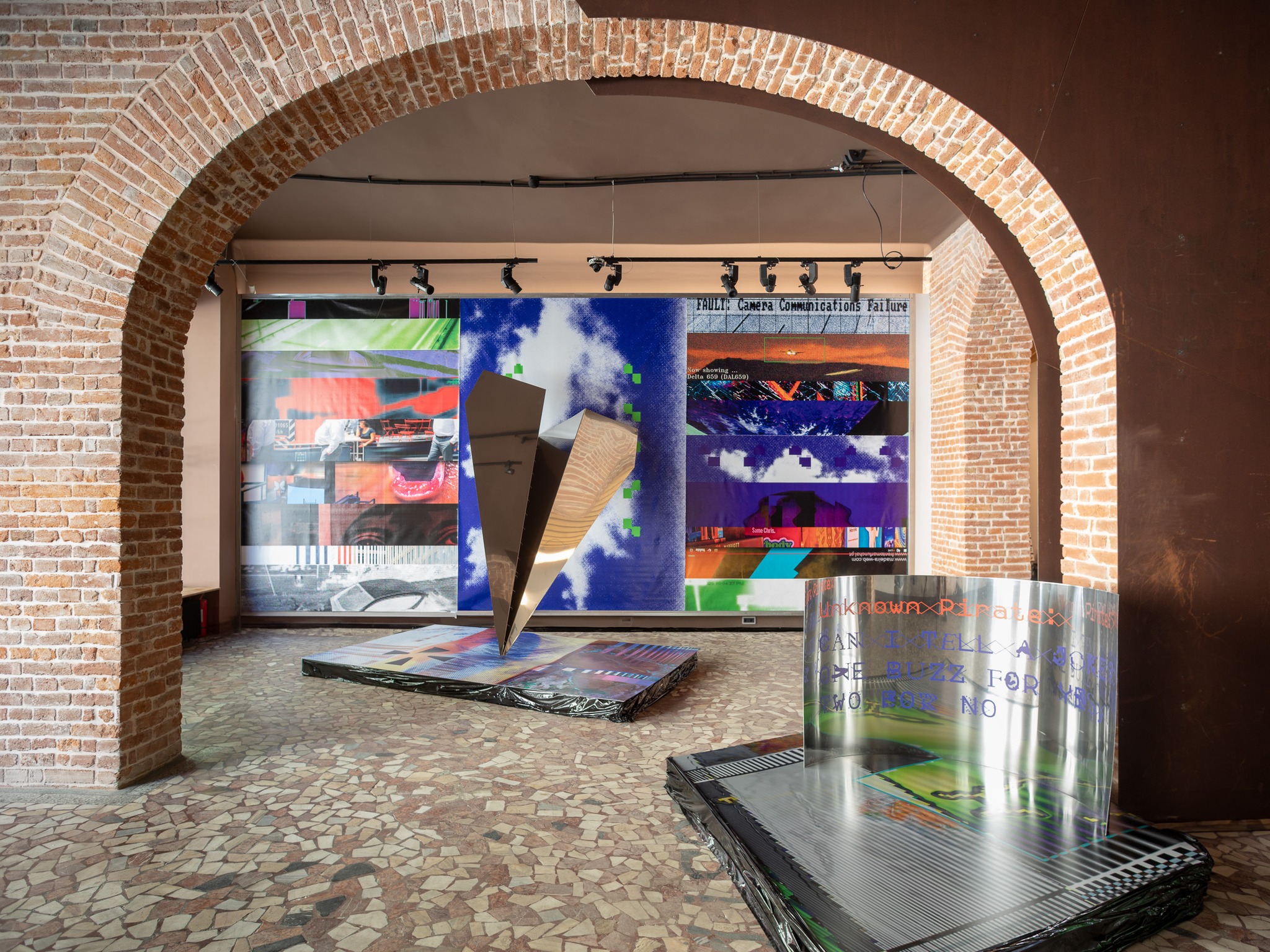 “Blind Spot” holds up a mirror to the invisible processes that define violence today: sophisticated technological networks operating both in times of action and waiting. Visitors navigate a hallucinatory environment of familiar yet distorted symbols – calibration markers, maps, diagrams – that become the backdrop for sculptural interventions imagining what might happen if the operational violence of capitalism were disrupted.