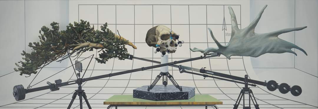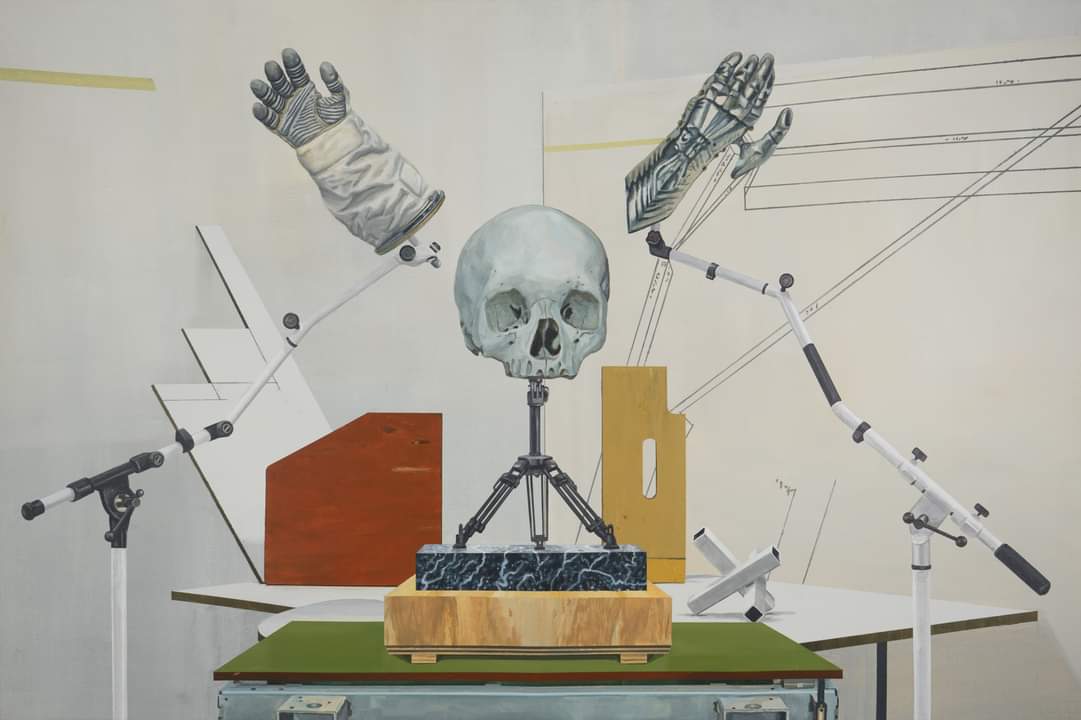 Man and his existence are shown to us in dioramas through familiar objects, some ancient, others that send us into the future, as in a series of contemporary vanitas.