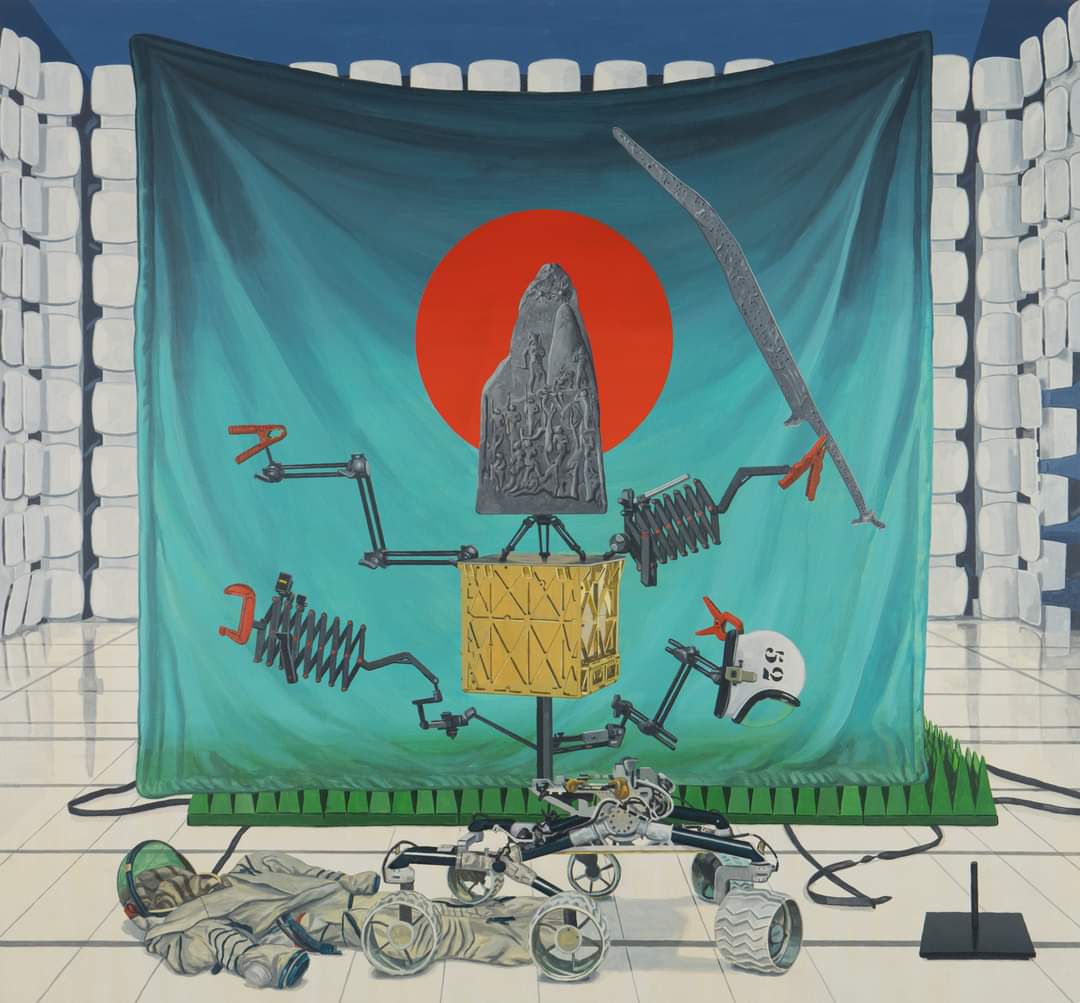 Man and his existence are shown to us in dioramas through familiar objects, some ancient, others that send us into the future, as in a series of contemporary vanitas.