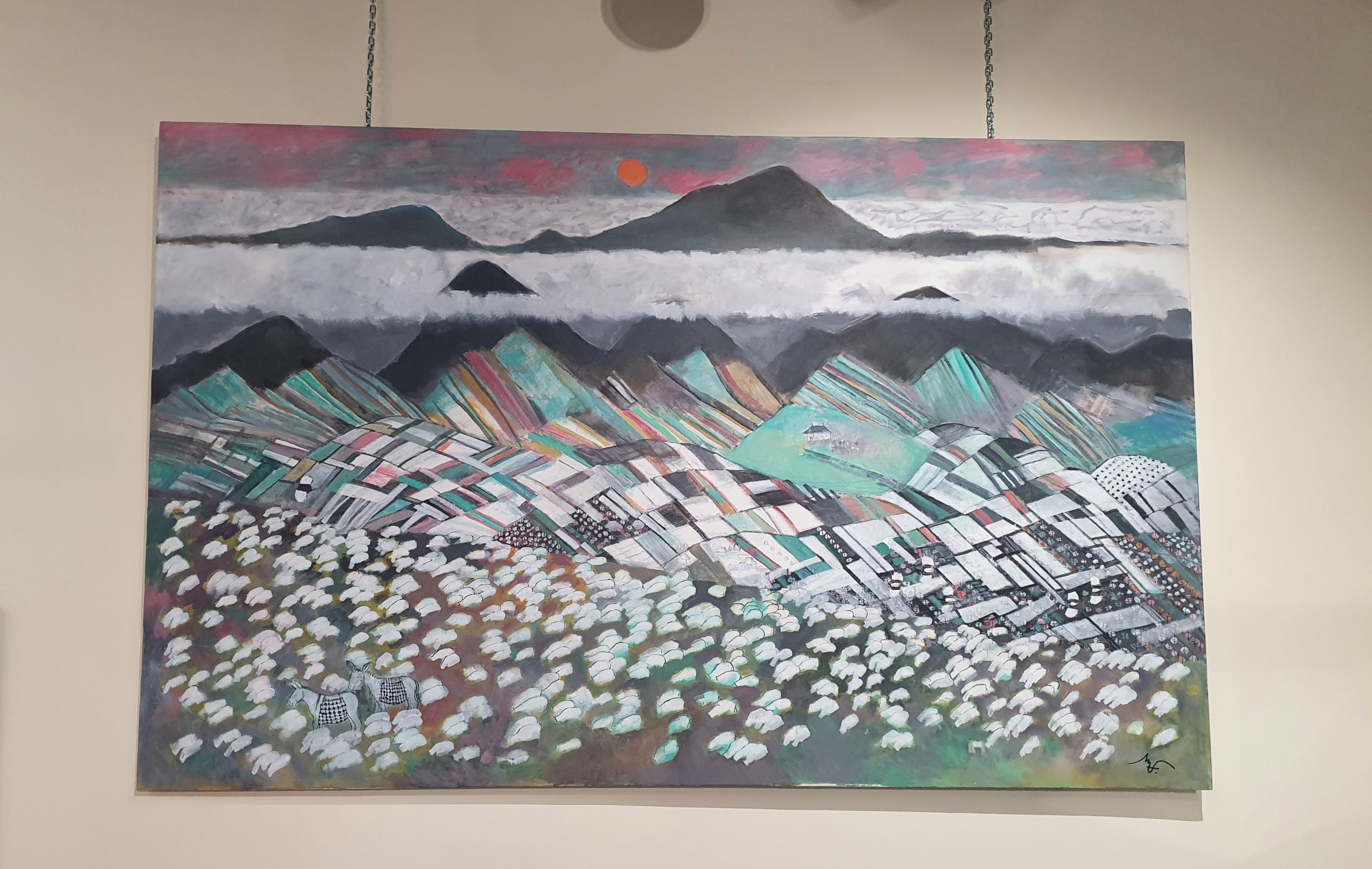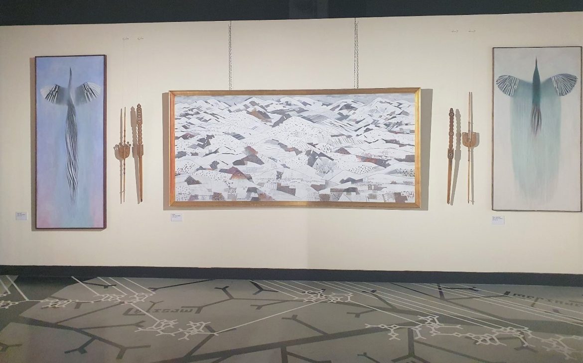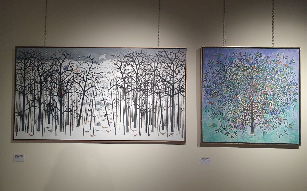 “35 paintings painted by Viorel Mărginean are exhibited along with heritage objects from the collections of the ASTRA Museum. The Church of Cenade is the warm core of light, appealing through silence, simplicity, and beauty. The collection of rugs and Romanian traditional clothing ( cătrinţe, fote, vâlnice, oprege, marame) outlines scenographically and poetically illustrates the hills, mountains, plains, orchards, and gardens blooming in the artist’s landscapes. It is worth mentioning the collection of 19 forks, representing an ideational forest, descended both from painting and from the mountains. Soul-birds, tomb pillars, and headdress rhyme metaphorically with the images of the paintings,” the organizers describe.