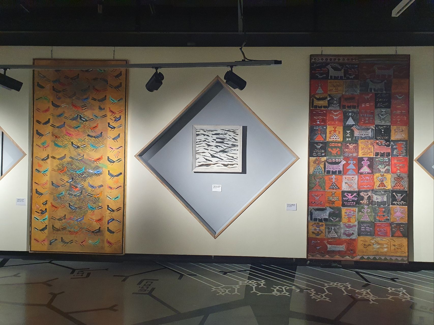 “35 paintings painted by Viorel Mărginean are exhibited along with heritage objects from the collections of the ASTRA Museum. The Church of Cenade is the warm core of light, appealing through silence, simplicity, and beauty. The collection of rugs and Romanian traditional clothing ( cătrinţe, fote, vâlnice, oprege, marame) outlines scenographically and poetically illustrates the hills, mountains, plains, orchards, and gardens blooming in the artist’s landscapes. It is worth mentioning the collection of 19 forks, representing an ideational forest, descended both from painting and from the mountains. Soul-birds, tomb pillars, and headdress rhyme metaphorically with the images of the paintings,” the organizers describe.