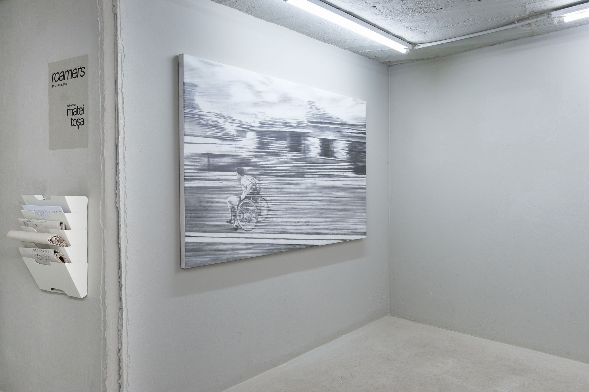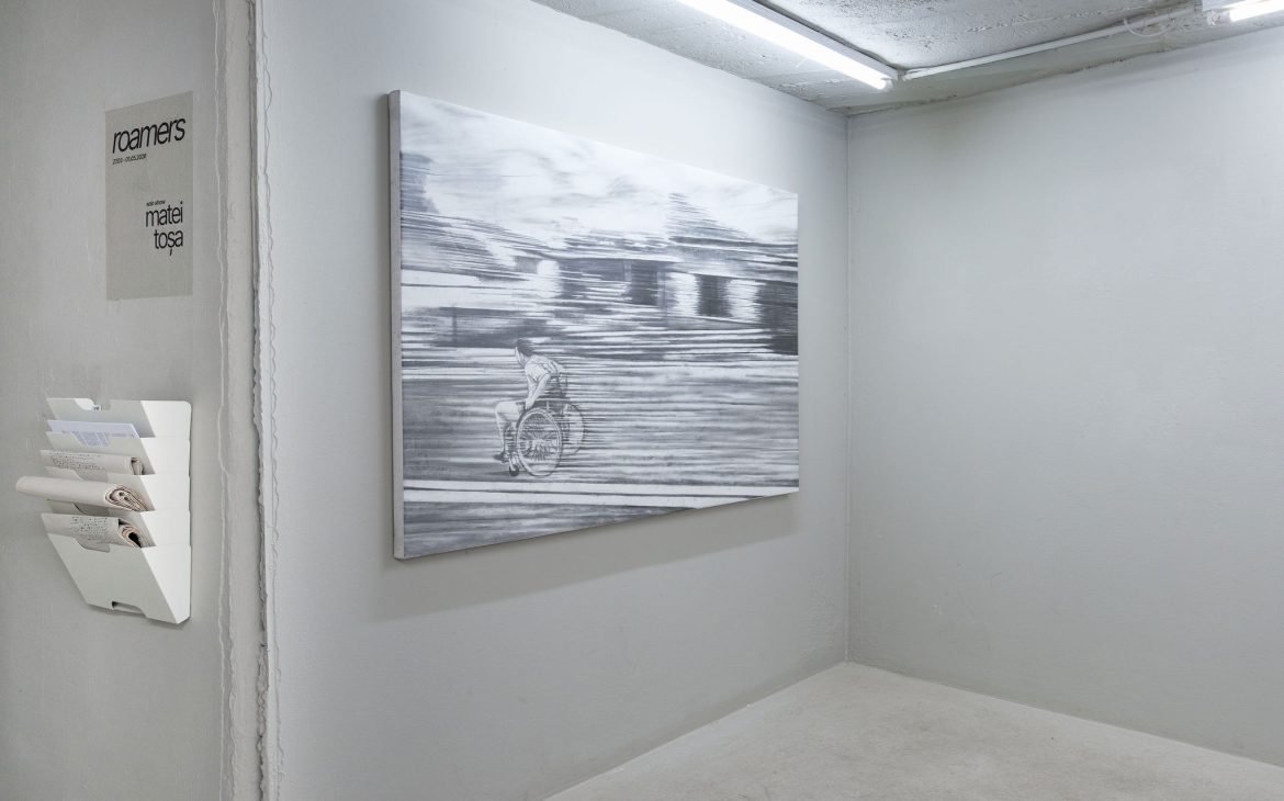 The exhibition’s title functions as a metaphor for a state of “in-betweenness” — between spaces, states, and realities. Roamers develops from a local story connected to the area known as “Dead Man’s Curve” in Cluj-Napoca, a site marked by accidents and layered with collective memory. Within this context, the artist constructs speculative fictions in which reality intersects with haunted scenarios populated by figures in constant drift. The space thus becomes one of tension and fragility, where the sense of safety is continuously destabilized.
