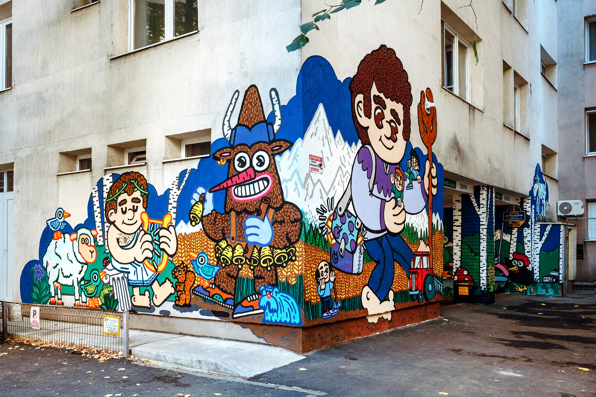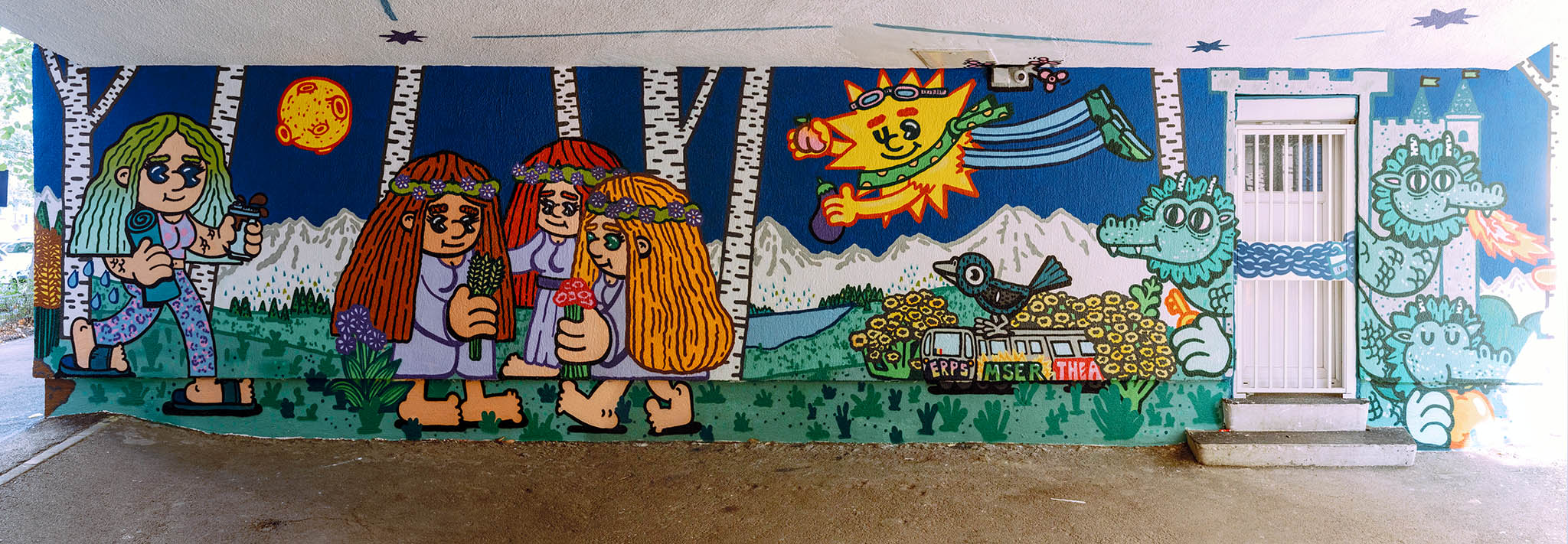 The mural painting “Tales” is a visual representation of the shared folklore of the Balkan region, mainly focusing on the rich traditions of Romania, Bulgaria, and Serbia. It depicts characters like Karakondzul / Kallikantzaros, Lesnik / Leshy, Rusalka, Simargl, Zburătorul, Ala / Hala, the Giant, and Orpheus, amongst vampires, dragons, bikers, and graffiti writers. To add even more fun to the artwork, Aleksi gave a shout-out to the Bucharest graffiti scene, including an IVA subway with throw-ups by Mser and Erps. One of his characters is wearing a gold necklace with an Aeul pendant.