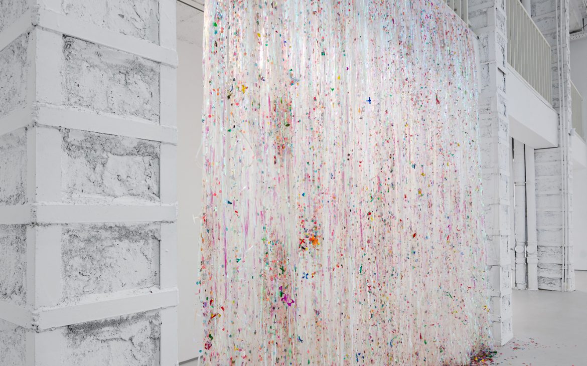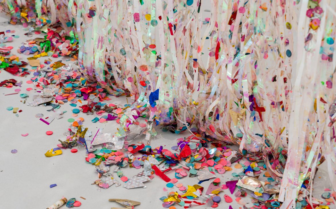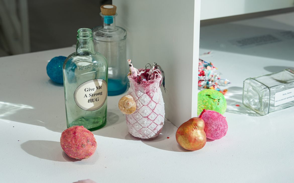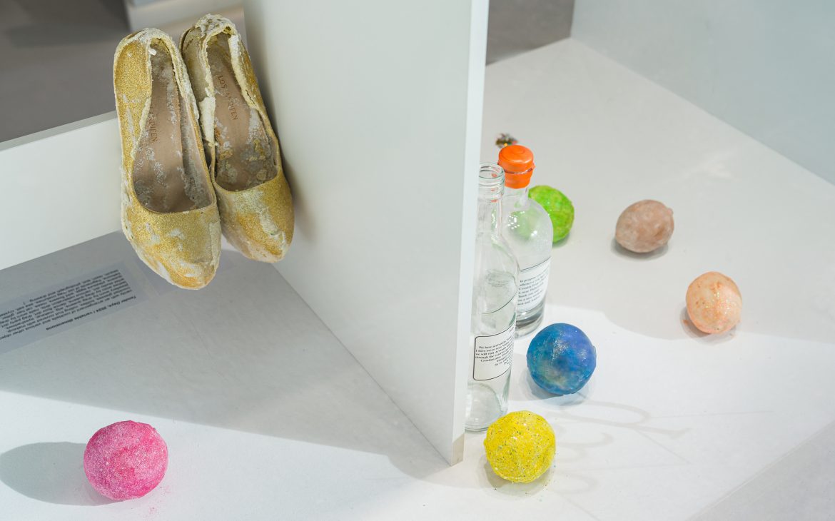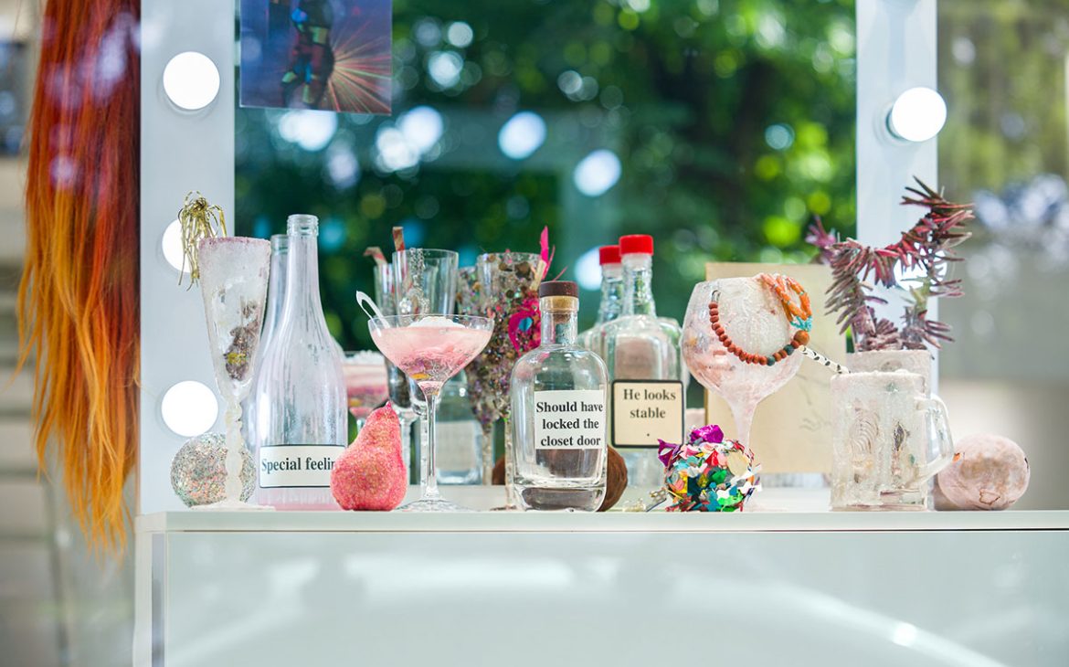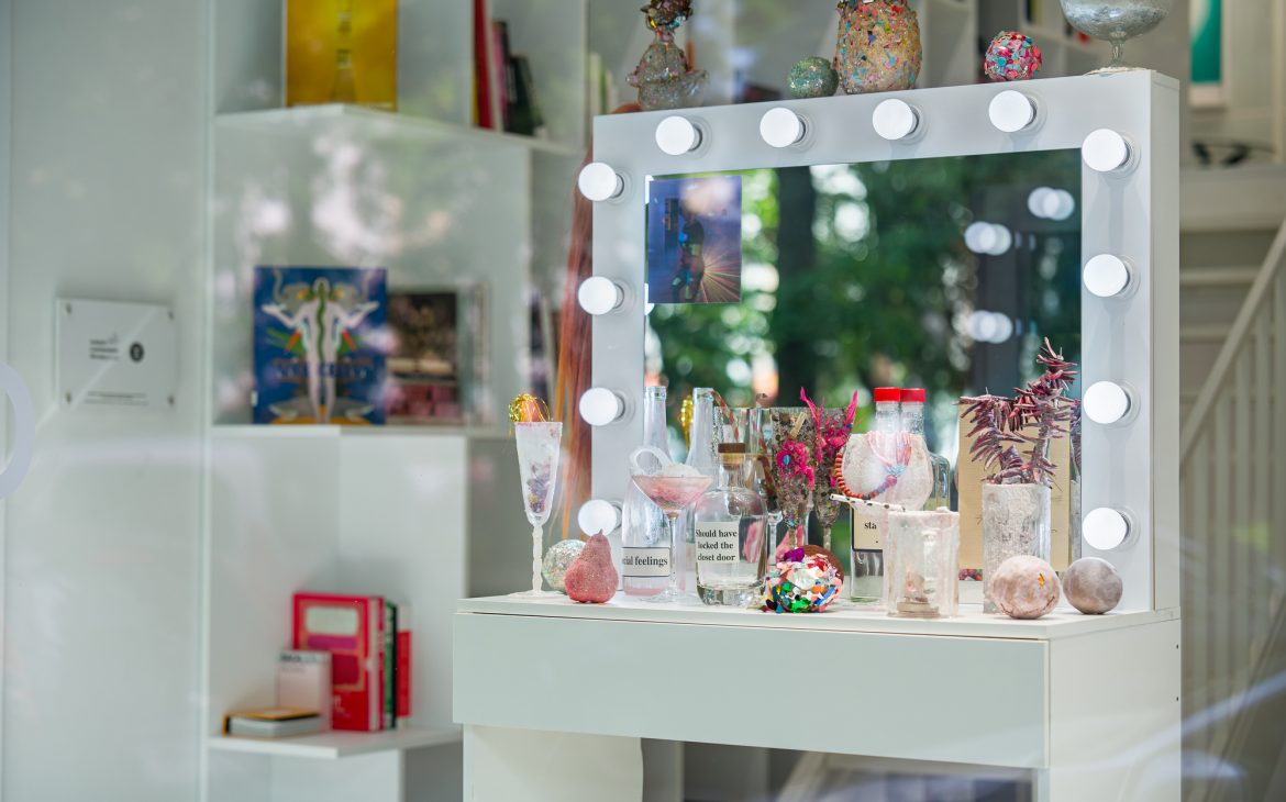 Among the works, there’s a small box containing a handful of sparkling dirt. Over the years, I’ve collected this material from parties and dance floors. After the queers would leave for afterparties, the dance floors would be swept, and I’d filter out the shiny bits—like searching for gold, in a way. I’ll be using this dirt to dress a waterfall for you.
