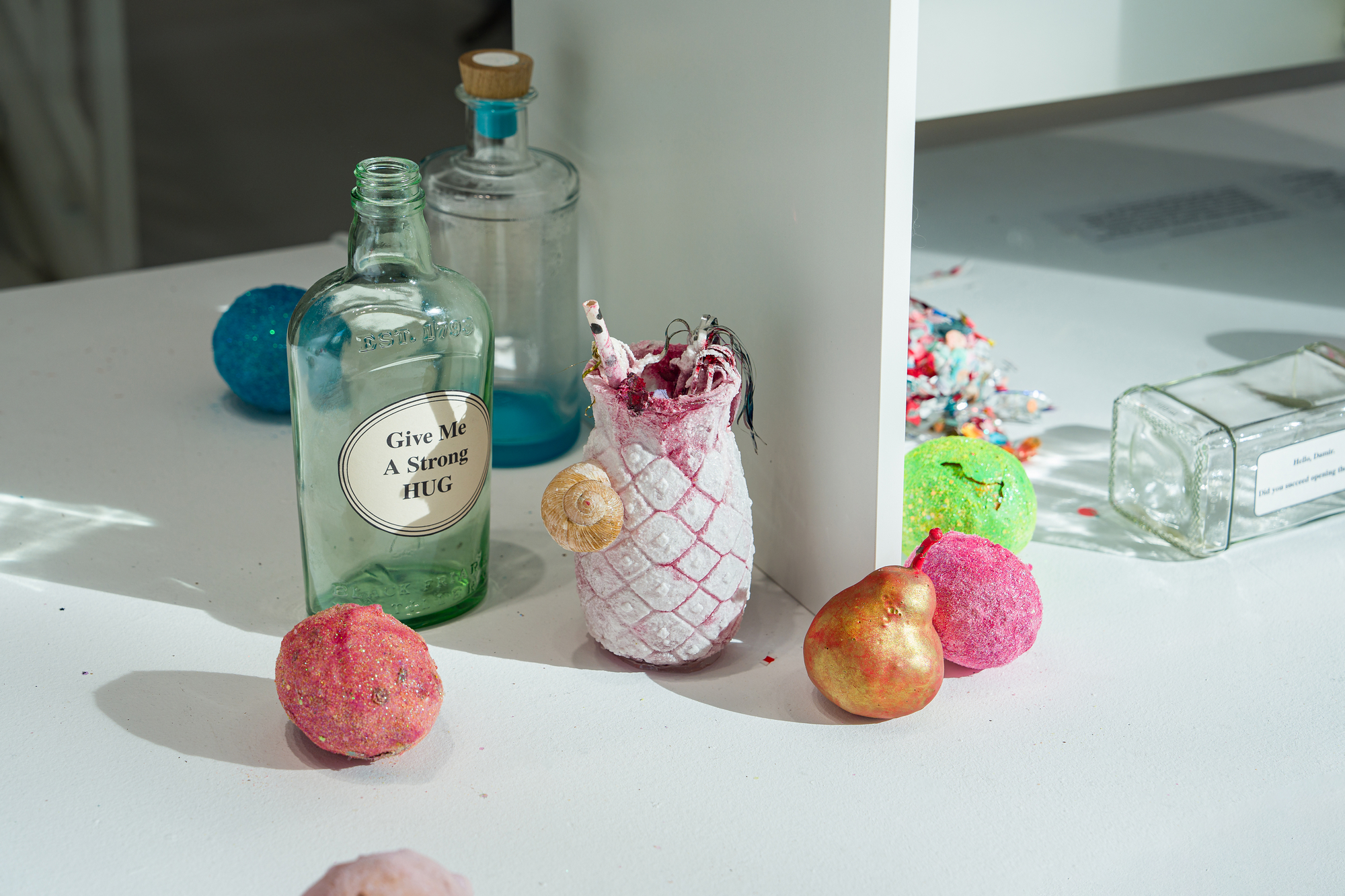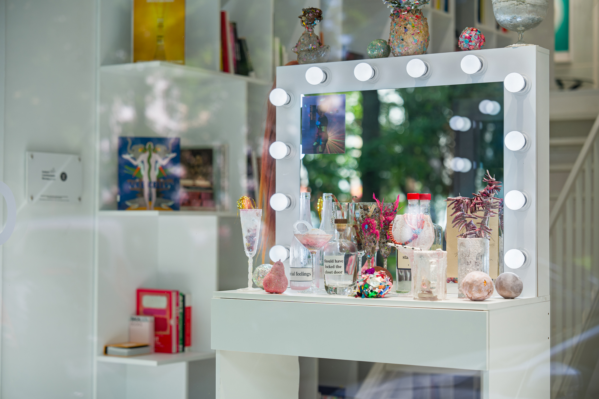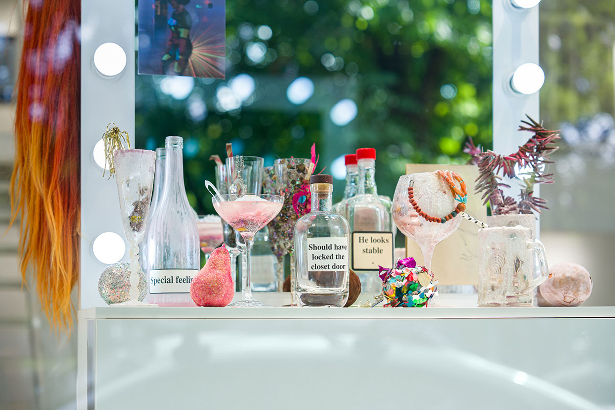 Among the works, there’s a small box containing a handful of sparkling dirt. Over the years, I’ve collected this material from parties and dance floors. After the queers would leave for afterparties, the dance floors would be swept, and I’d filter out the shiny bits—like searching for gold, in a way. I’ll be using this dirt to dress a waterfall for you.