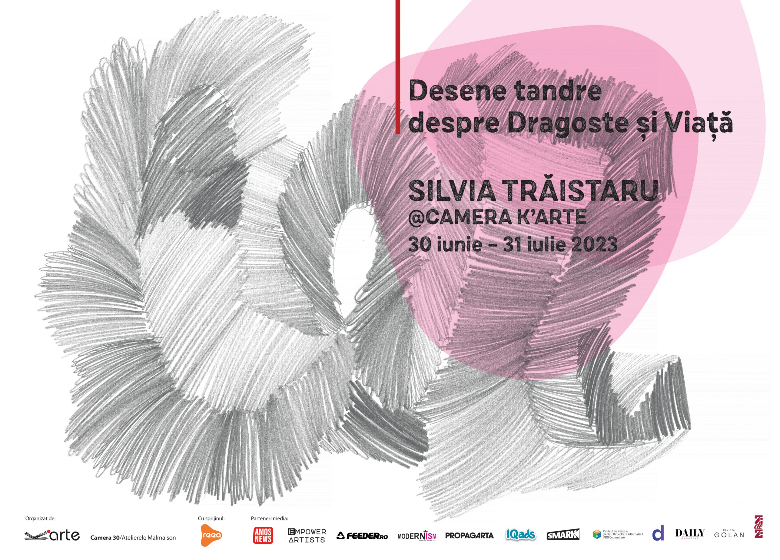 The exhibition “Tender Drawings about Love and Life” can be visited until July 31, 2023, in the Camera K’ARTE, George Enescu street, no. 2, Târgu Mureș 540052, Romania, from Monday to Friday, between 5:00 p.m. and 7:00 p.m. or by appointment at 072390986.