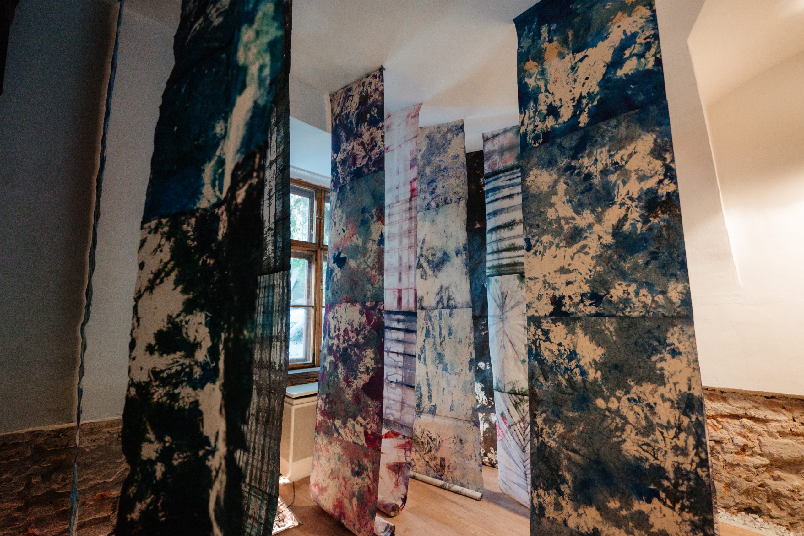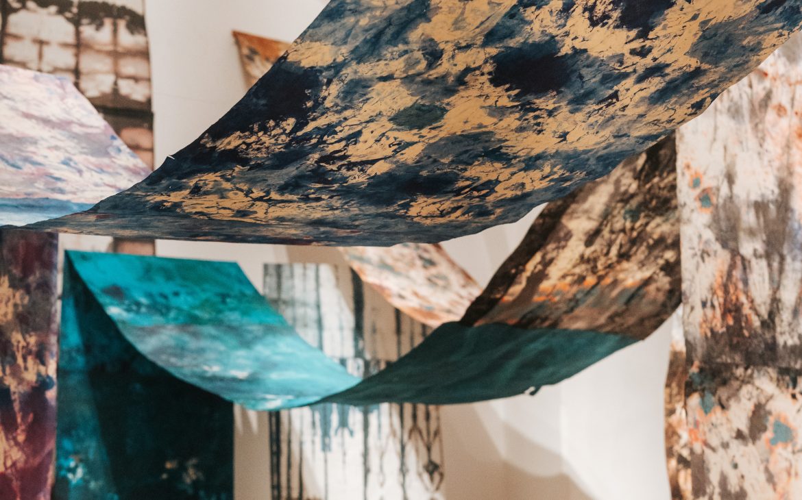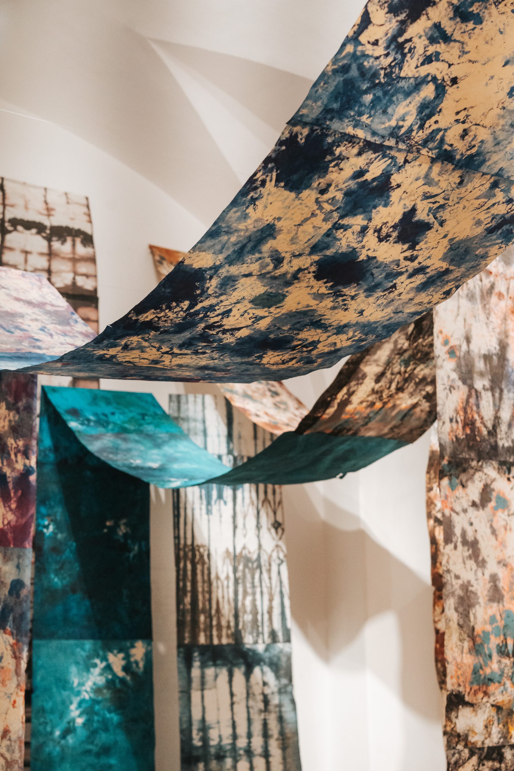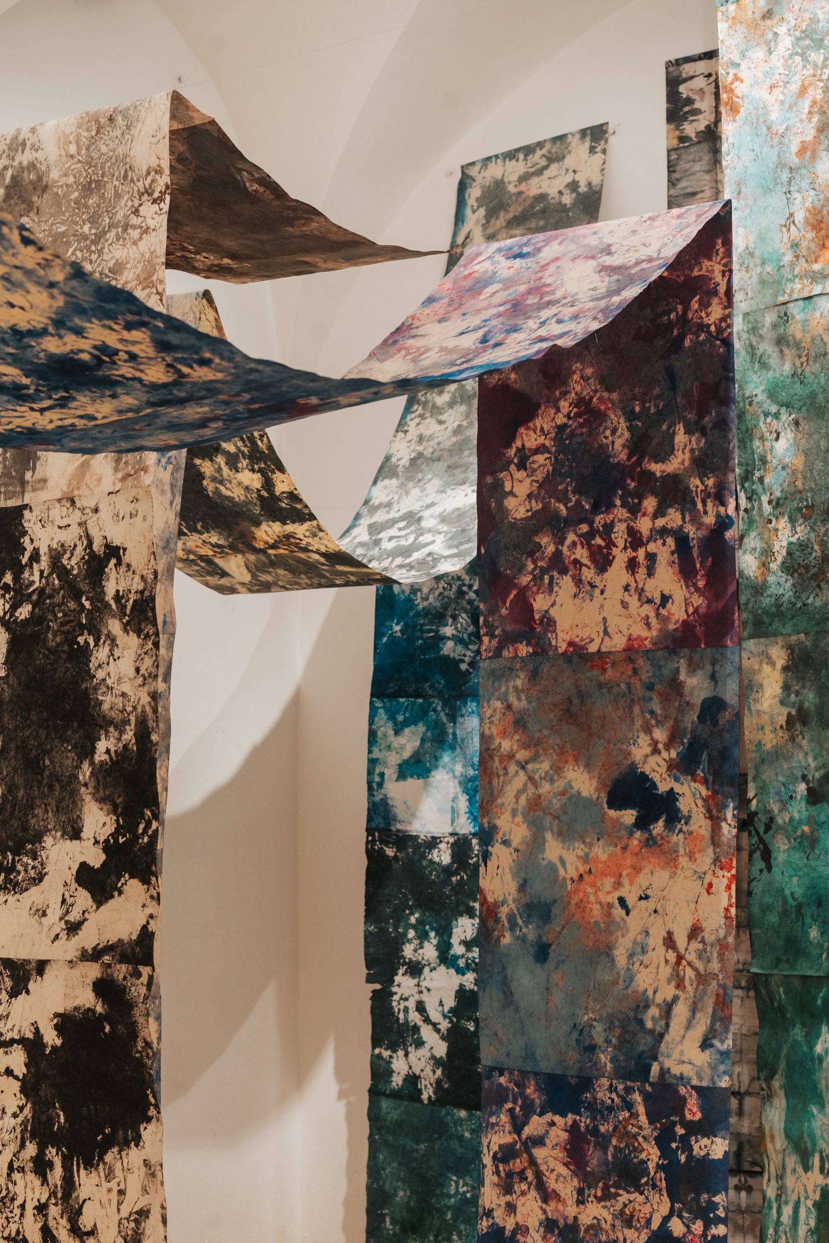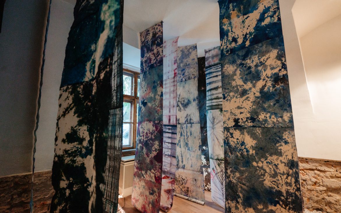 For my intervention, I returned to the “INDIGO” series, which I began in 2017: I gathered and rearranged existing works, created new pieces, and recomposed the universe of the series so that it reflects my current moment of introspection. In these works, touch — both physical and symbolic — takes on a special weight. It becomes a mean of closeness, of knowledge, and of rediscovery. The materials used, especially the dyed silk paper, demand care, attention, and full presence, and the work process transforms into a creative gesture through which I can explore my inner world.