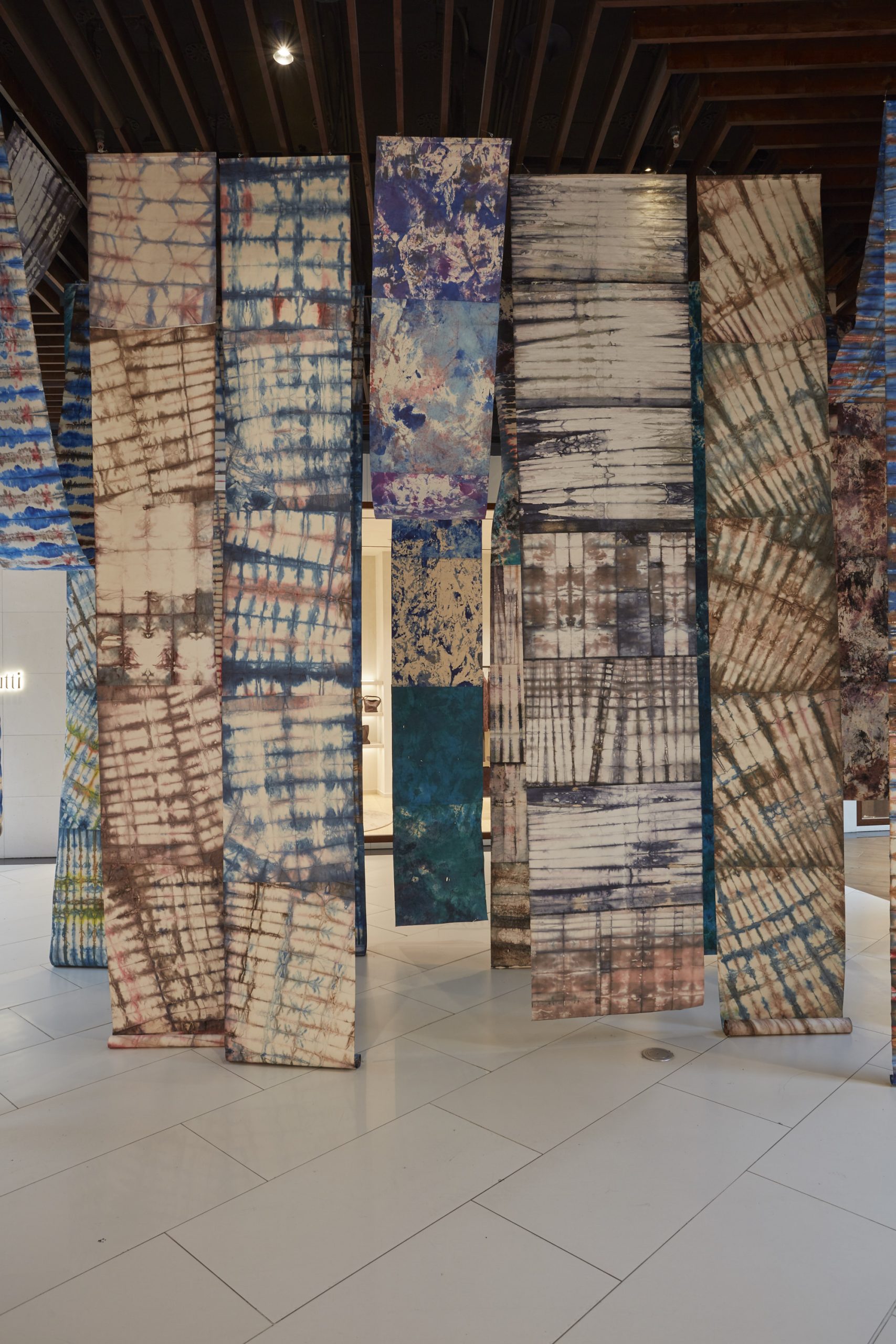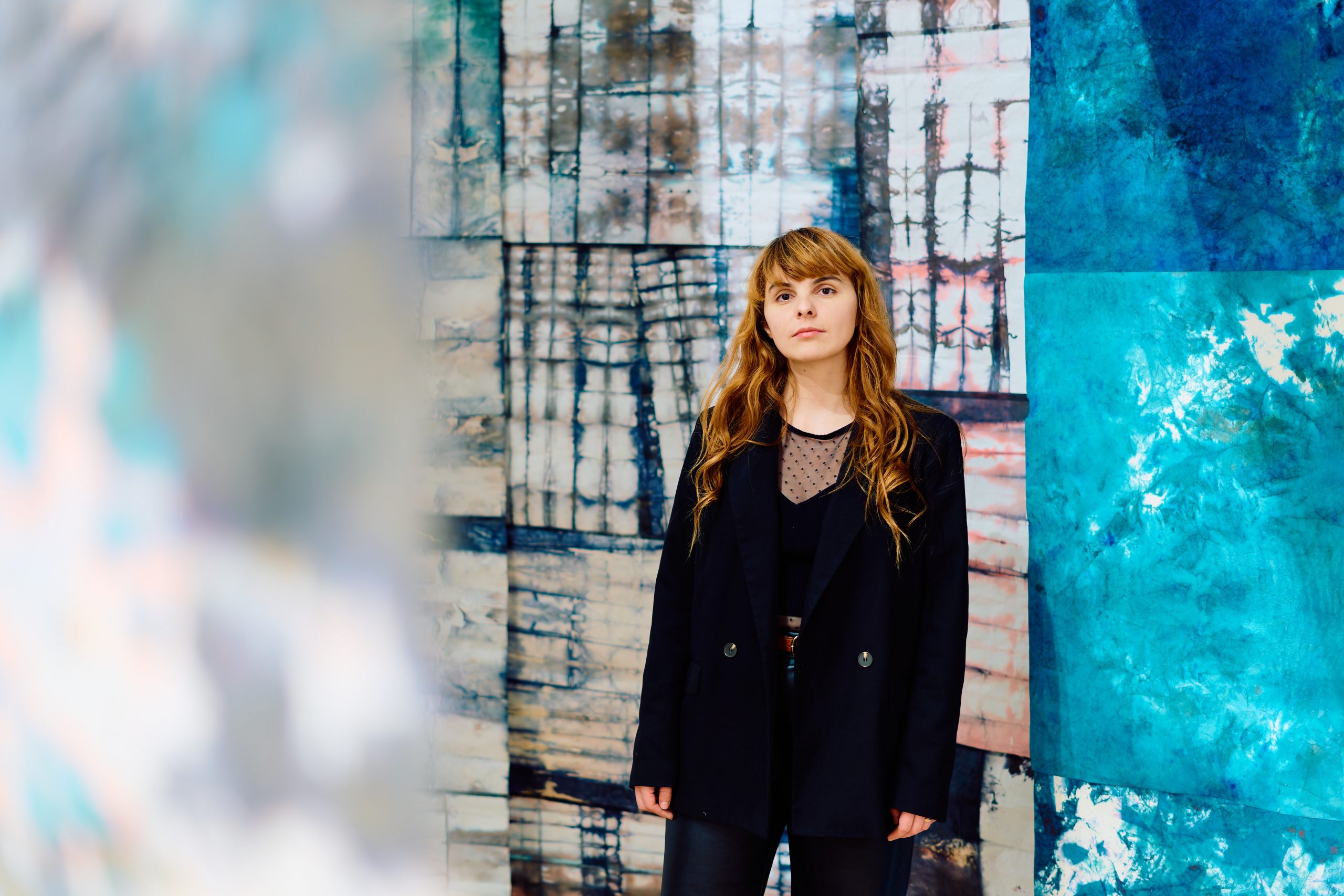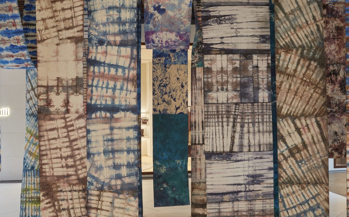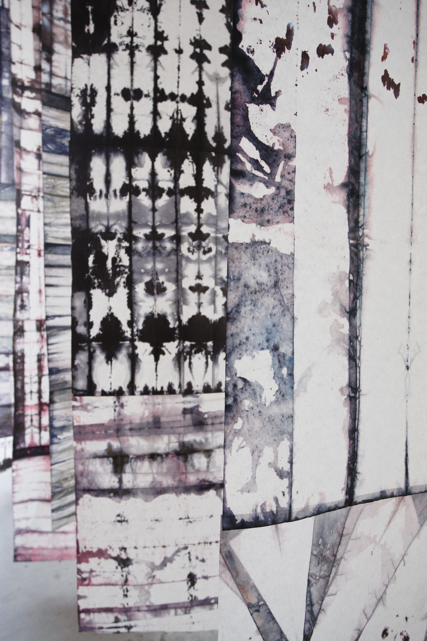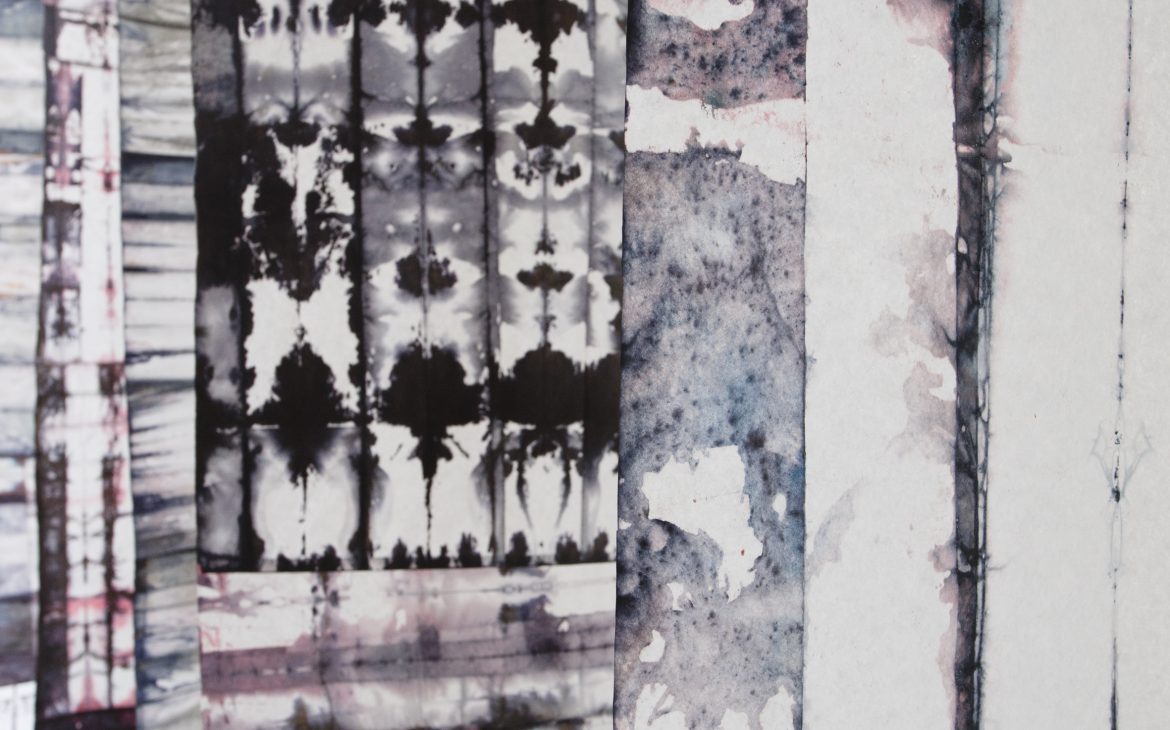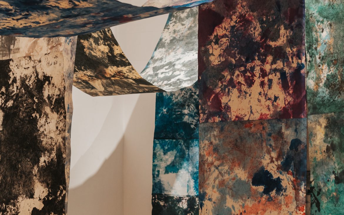 For my intervention, I returned to the “INDIGO” series, which I began in 2017: I gathered and rearranged existing works, created new pieces, and recomposed the universe of the series so that it reflects my current moment of introspection. In these works, touch — both physical and symbolic — takes on a special weight. It becomes a mean of closeness, of knowledge, and of rediscovery. The materials used, especially the dyed silk paper, demand care, attention, and full presence, and the work process transforms into a creative gesture through which I can explore my inner world.