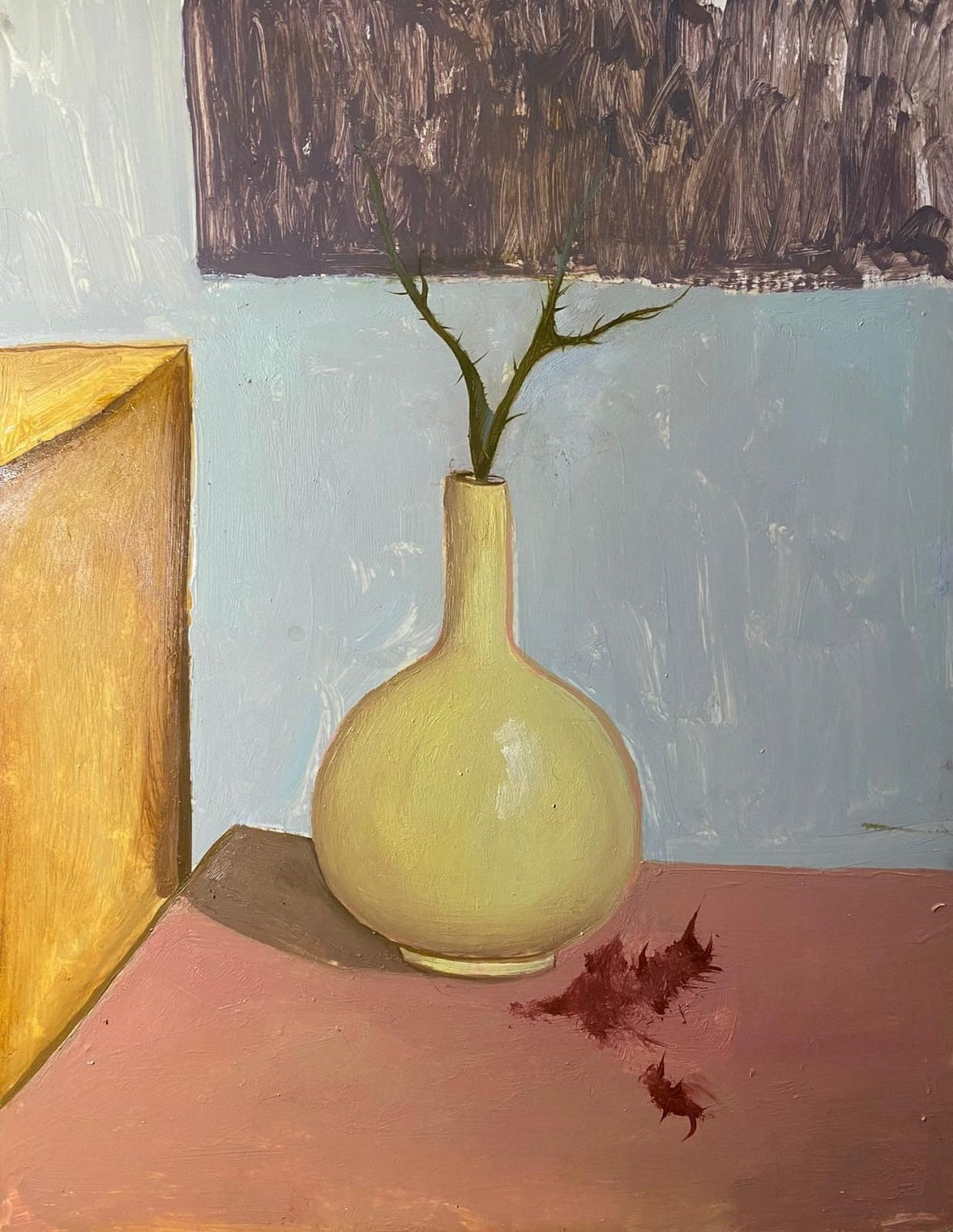 Later, the animal figure dominates the field in almost every painting but as an intruder. What is he looking at the window? What is he looking for after the vase? What is he looking for on his hand? Isn’t that something you run away from, some fear? Maybe it’s you, metamorphosed and in a constant state of wakefulness.
