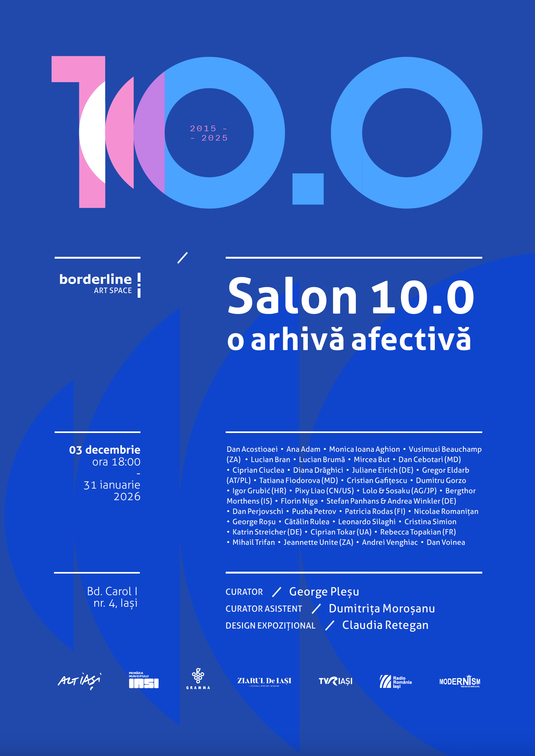 “Salon 10.0” is an affective map between worlds, a selection of works that, when shown together, do not follow a chronology but instead chart the visual thinking that has passed through the Borderline space over these years: from objects created on various continents to site-specific interventions conceived especially for Iași, from politics or intimacy to documentary fictions and personal archives. Last but not least, this exhibition is a commentary on the process of archiving: on how we preserve, forget, and reassess. Instead of a sealed box, the archive is alive, visible, and reactivatable.