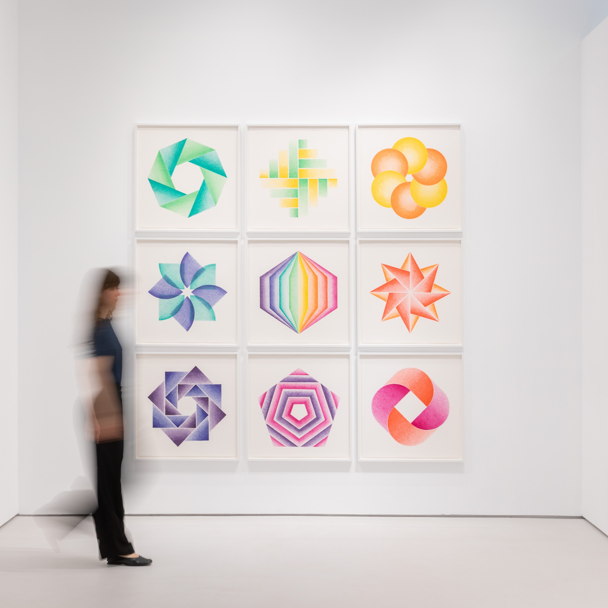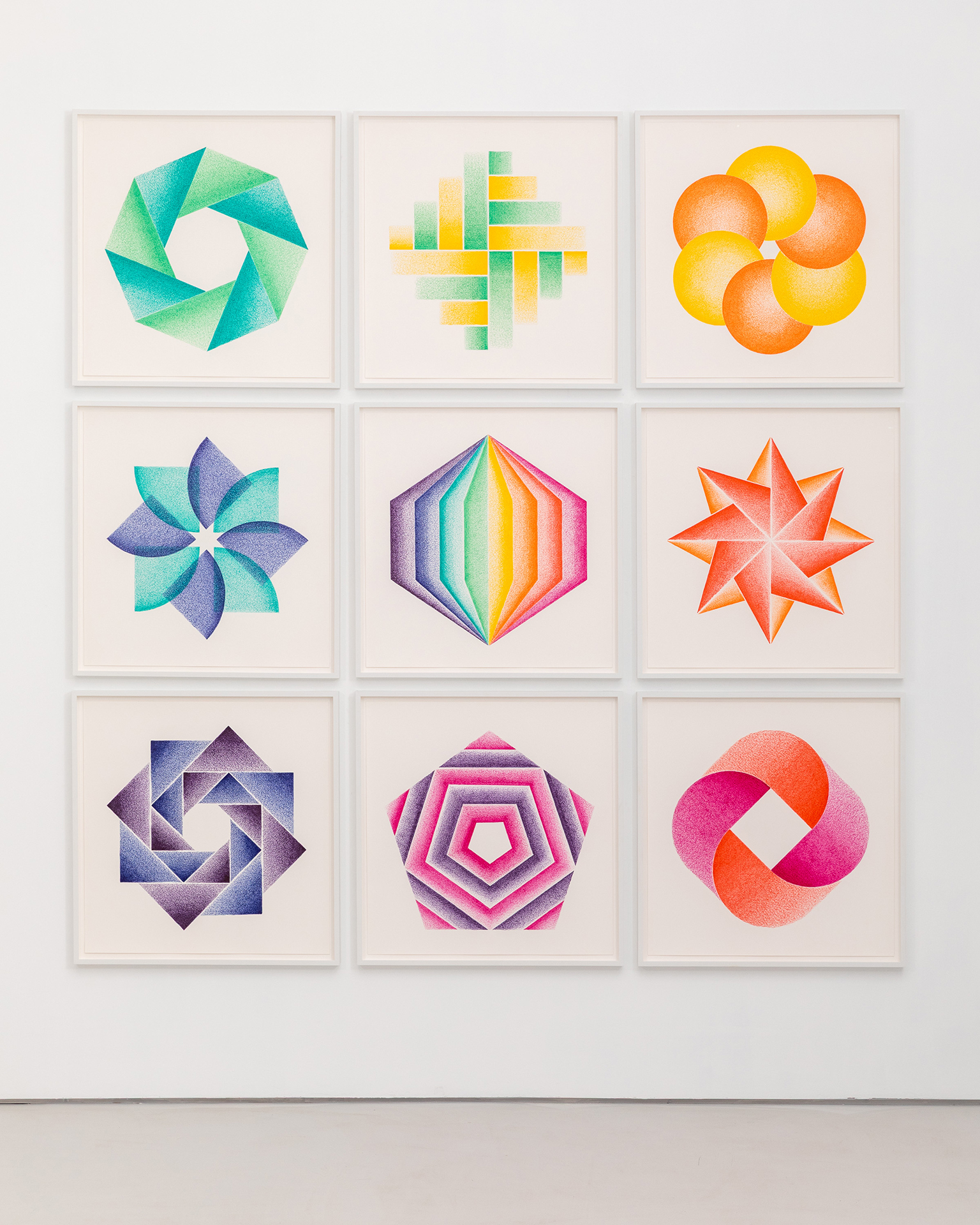 Cele 9 desene care dau titlul expoziției formează un grup de simboluri ce trimit la istoria designului grafic, dar pot fi asociate și cu semne cvasi-religioase. Sursa principală de inspirație o reprezintă logo-uri din anii ’50-’60, când un nou limbaj de design, caracterizat prin simplificare formală și optimism postbelic, a apărut. O altă posibilă interpretare, legată de iconografia spiritualității, se naște din iluzia unei lumini care ar părea să radieze din formele desenate. Noutatea cea mai evidentă este jocul cromatic creat de Uriarte pentru acest grup de lucrări – în cuvintele artistului, ele sunt „o călătorie prin culorile curcubeului”, inspirată de joaca cu fiica lui cea mare.