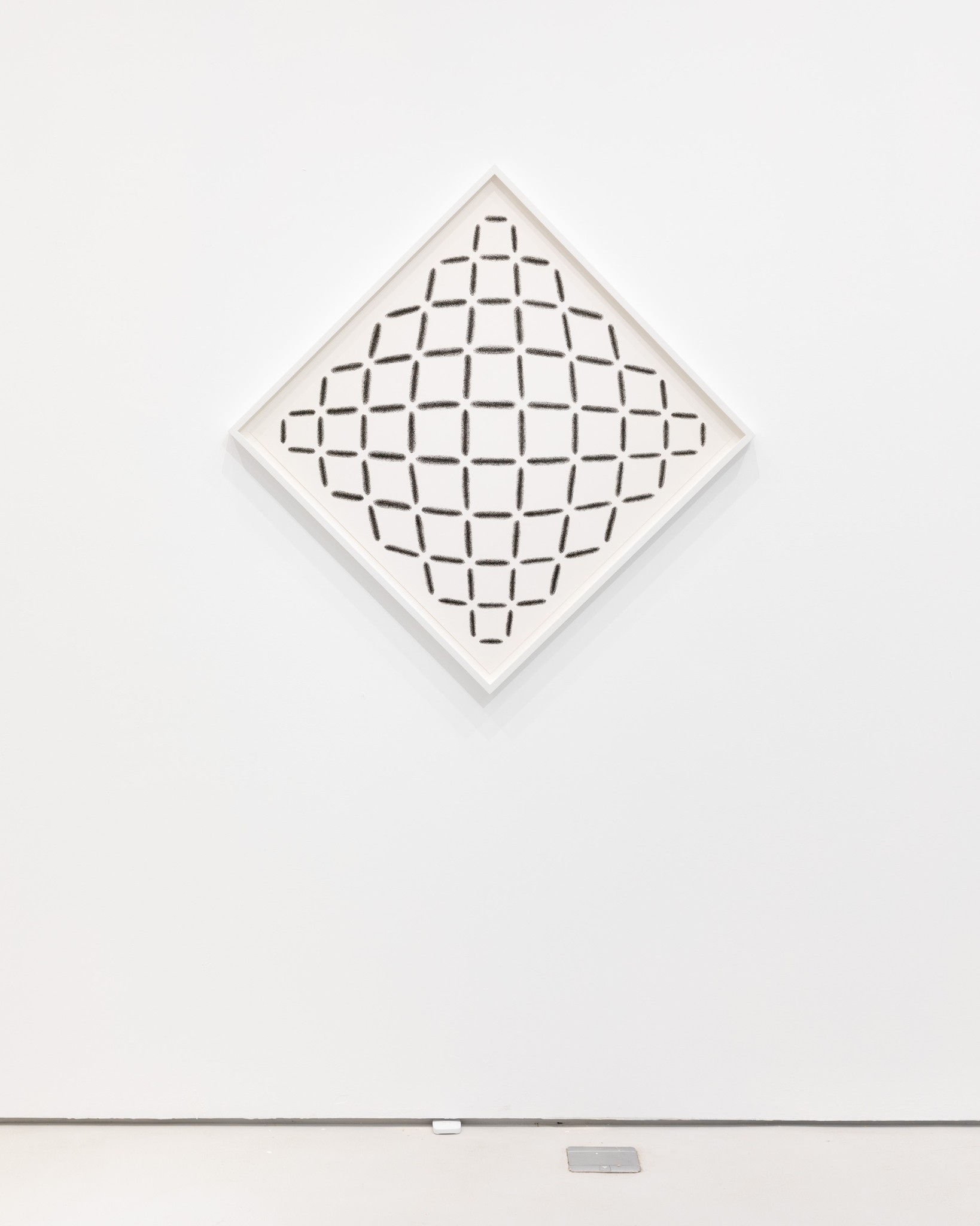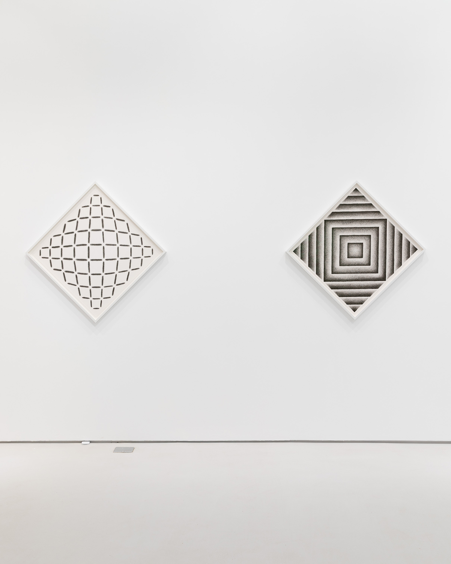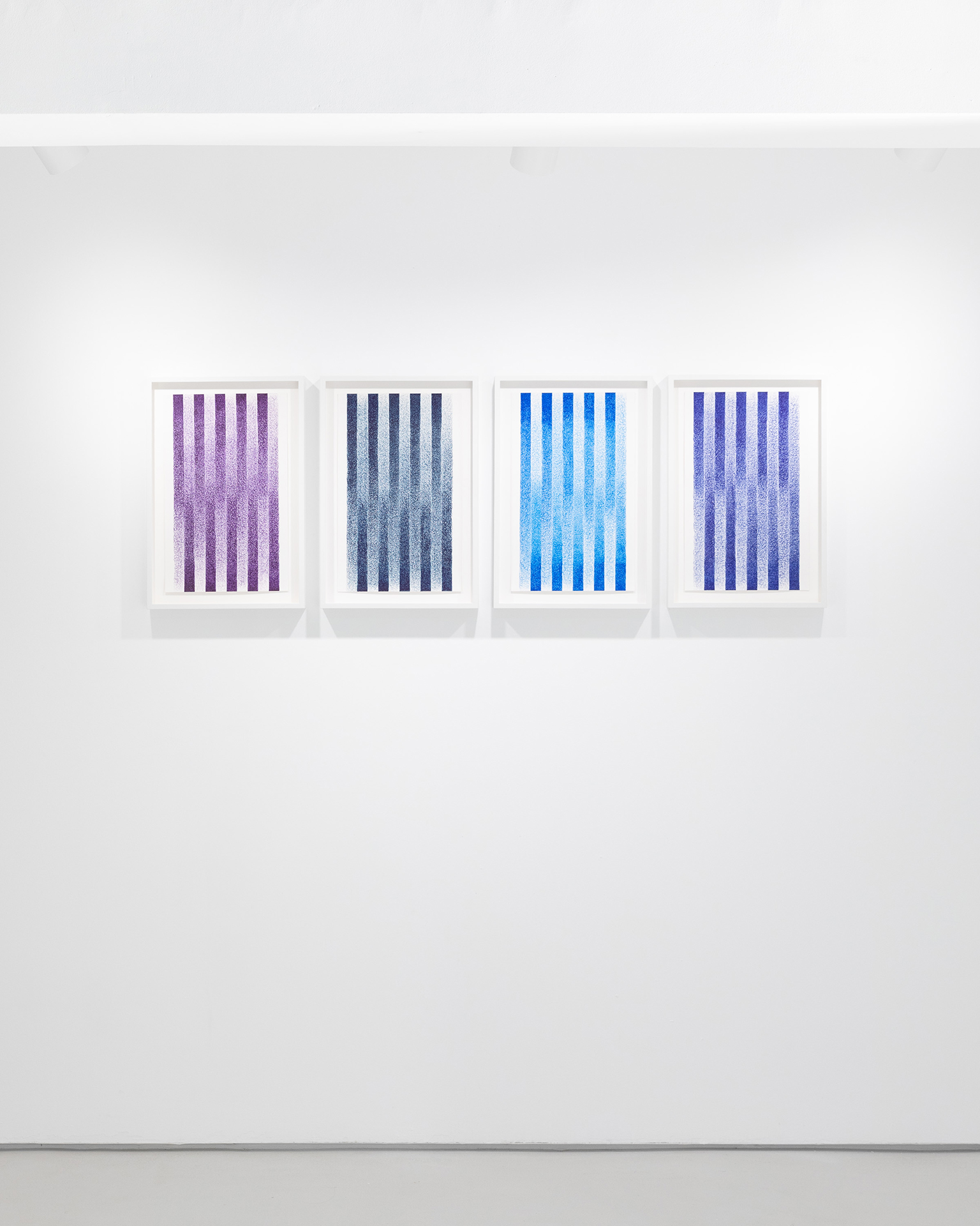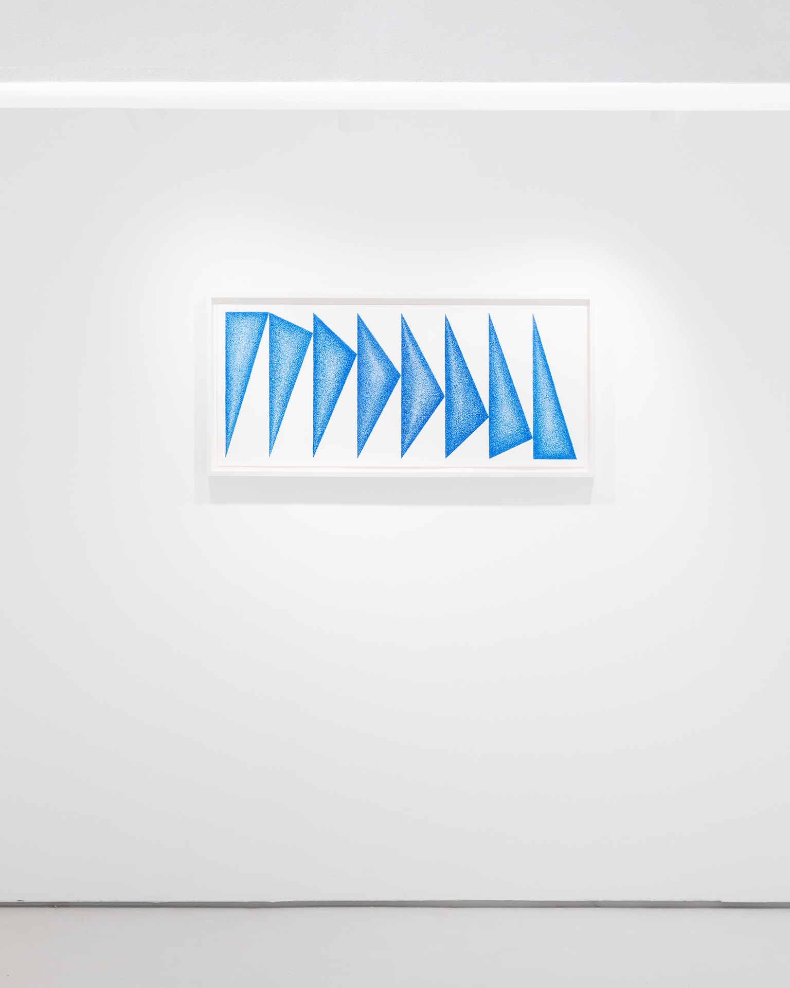 În celelalte desene din expoziție, Uriarte își limitează paleta la tonuri de albastru sau negru și recurge la forme geometrice (triunghiuri, pătrate, cercuri și semicercuri) pentru a se juca cu percepția vizuală a privitorului sau pentru a crea structuri din motive repetate. Construcția spațiului este adesea preocuparea sa principală în aceste lucrări, alături de chestiunea forțelor dinamice ce influențează direcția sau stabilitatea unui sistem. (text curatorial)
