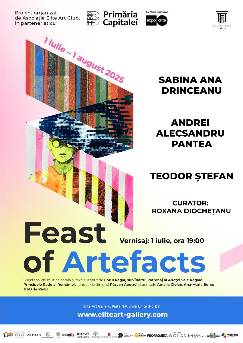 În perioada 1 iulie – 1 august 2025, Elite Art Gallery găzduiește expoziția Feast of Artefacts, semnată de cei trei artiști invitați în calitate de jurați ai concursului #FRESH, ediția a VIII-a: Sabina Ana Drinceanu, Andrei Alecsandru Pantea și Teodor Ștefan.