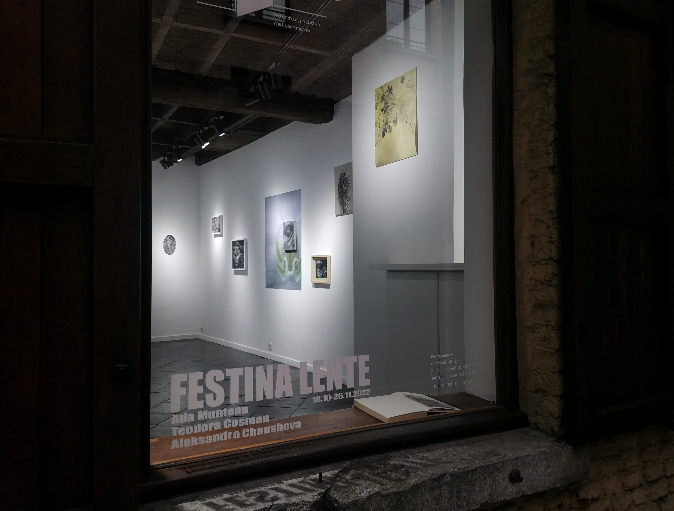 Corpul de lucrări prezentat în expoziția de grup Festina lente este rezultatul unei observații atât de intense și lente (și regulate, și repetitive), fie că sunt „autoportretele” meticulos desenate ale Aleksandrei Chaushova, fie reprezentările ex-statice ale Adei Muntean sau studiile luminoase ale Teodorei Cosman.
