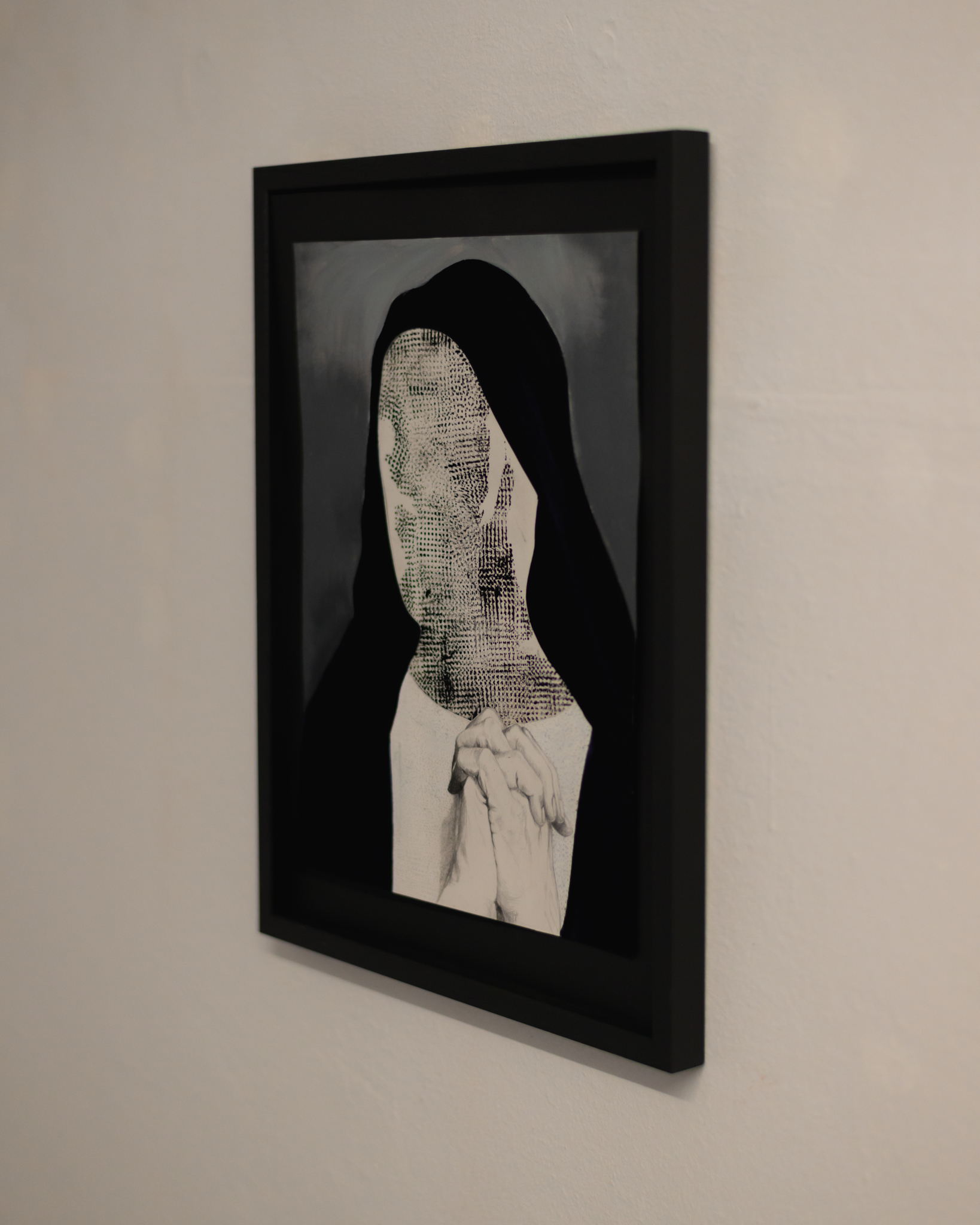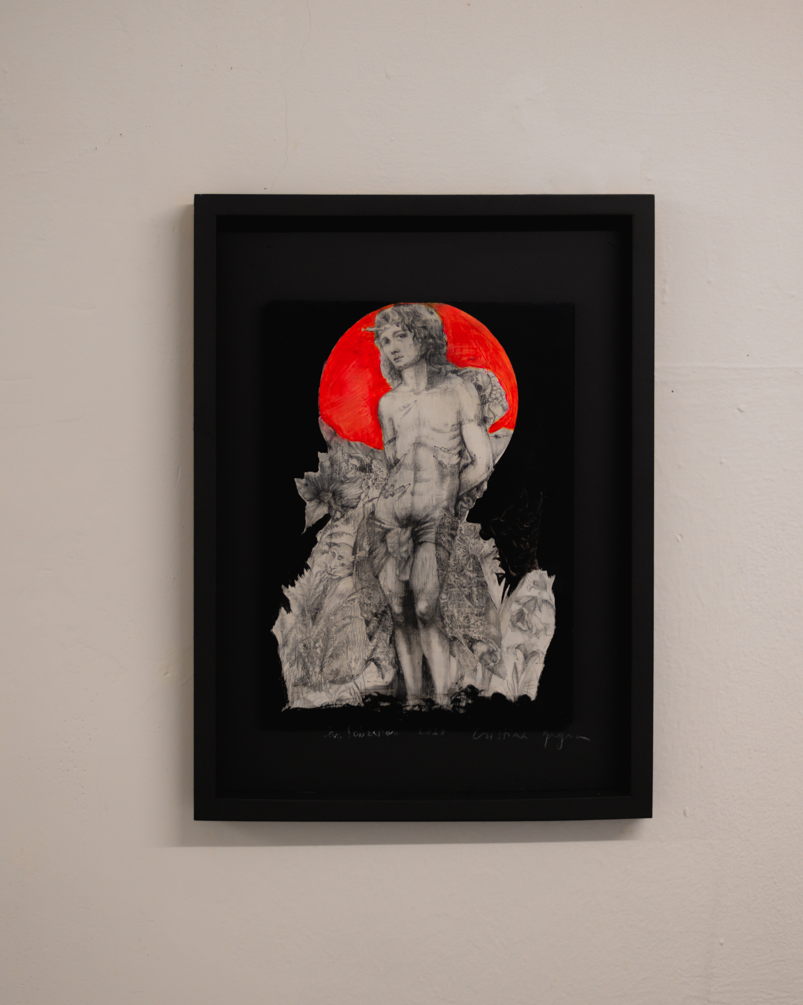 Cristina Daniela Gagiu propune o răsturnare a iconografiei clasic creștine în intervenția-colaj „Laces”, în raport direct cu „Apparently”, lucrare în creion pe hârtie și „San Sebastian”, mixed media în cambrit, creion, tuș și acrilic.
