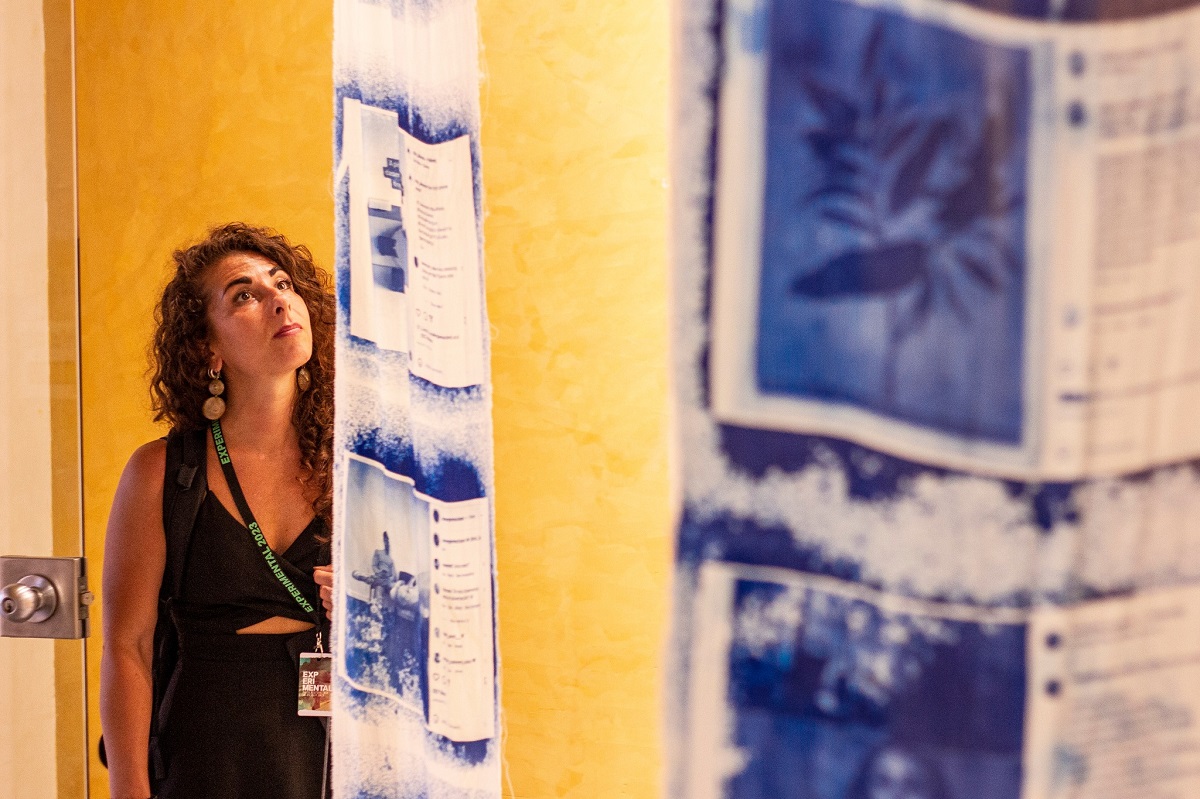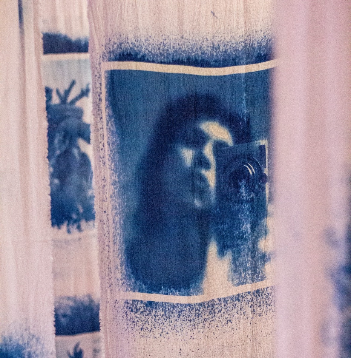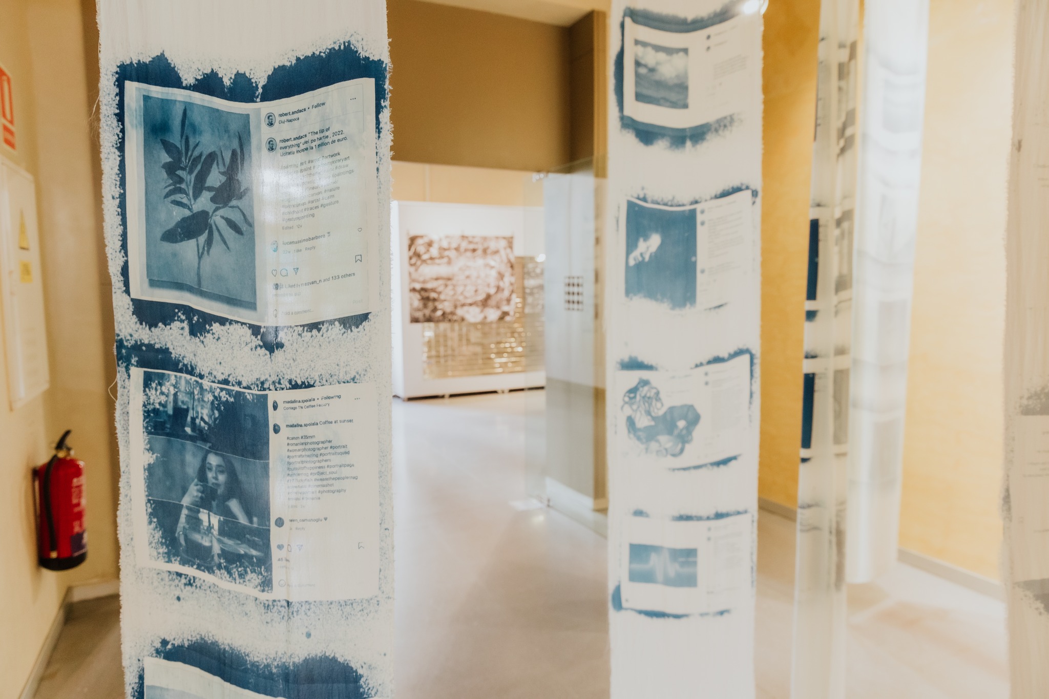 Aducând la un loc analogul și digitalul, imaginile digitally native sau digitalizate sunt aduse în mediul fizic în Share, Tag or Dye Again printr-o tehnică fotografică nu doar sustenabilă, ci și cu o istorie de 180 de ani – cianotipia, bazată pe săruri feroase care sunt sensibile la UV și din care rezultă imagini de un albastru specific.