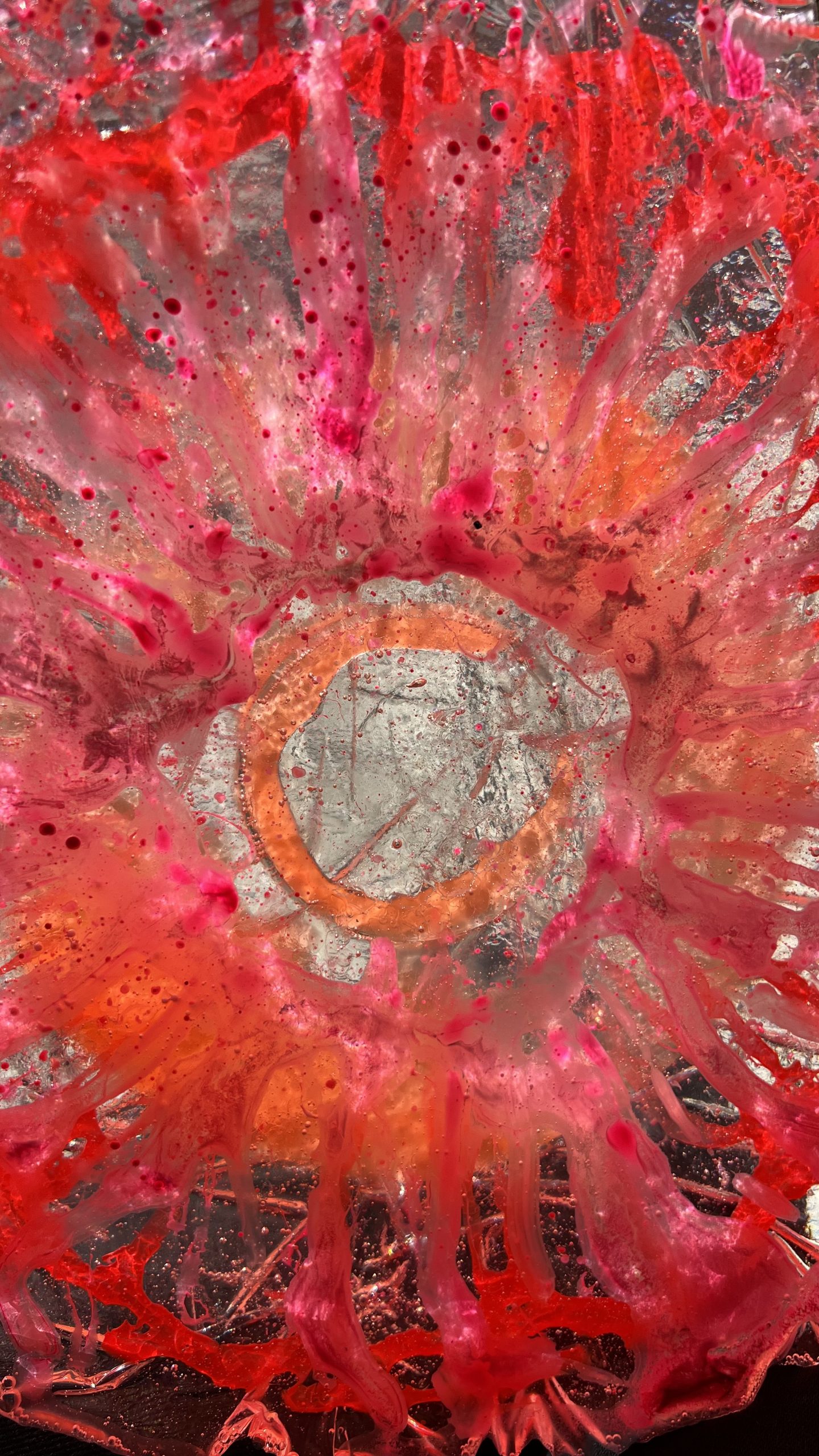 “Cu această expoziție, artista revine la materialul care a consacrat-o din punct de vedere vizual – rășina –, după o perioadă de experimente tehnice, care au mers de la pictură la căutarea permanentă de a ieși din „rama tabloului” prin volumetrie explozivă, tăietură, asamblaj sau colaj.