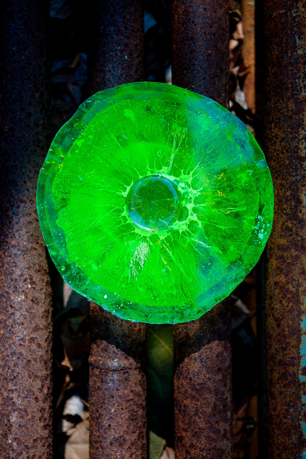 O serie de iriși plutind transparent în spațiu, aparent traversați de aer, în culori fluide și schimbătoare: așa arată „lentilele” seducătoare pe care artista le pune le dispoziția fiecărui privitor, pe post de ocheane interioare. Căci călătoria la care ne invită expoziția Marinei Aristotel nu este una „peste mări și țări” – asta doar dacă nu cumva „mările și țările” iau formele de relief ale stărilor noastre interioare. Despre stări și lumi interioare e vorba în această imersiune printre irișii de rășină ai Marinei Aristotel.”