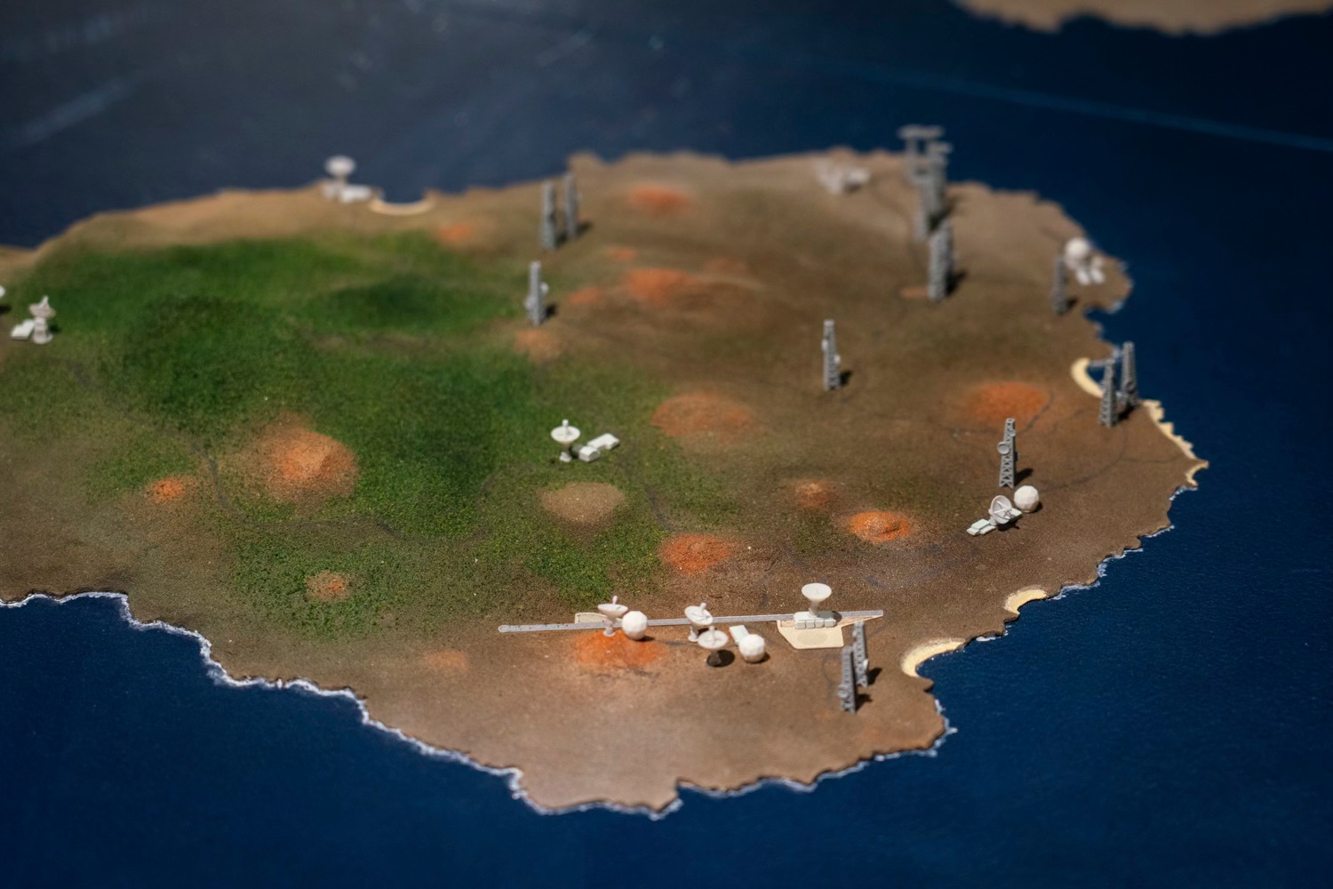 Empire’s Island (2023) spune povestea insulei Ascension, situată în mijlocul Oceanului Atlantic, printr-o serie de mișcări telescopice care se apropie mai întâi de acest petic de pământ și de istoria sa, iar apoi se îndepărtează pentru a cuprinde scara imperiului, a planetei și a stratosferei. Un model dublu al insulei – aridă și nelocuită în stânga, transformată, prin intervenții geologice și tehnologice, în dreapta –, însoțit de un eseu video, sugerează o istorie recursivă a acestui loc îndepărtat, al cărui trecut s-ar putea întoarce ca viitorul nostru. De-a lungul secolelor, insula a fost modificată în funcție de interesele ideologice, economice și militare dictate de evoluția unei structuri globale de putere. Această istorie a început cu imperiul olandez, care a folosit insula neprimitoare drept penitenciar, pentru a exila – și, indirect, a condamna la moarte – membri ai echipajului Companiei Indiilor Orientale, și a continuat cu imperiul britanic, pentru care Charles Darwin a modificat climatul insulei, plantând aici sute de copaci aduși de la Grădinile Botanice Regale din Londra, copaci care fuseseră adunați anterior din toate coloniile britanice.